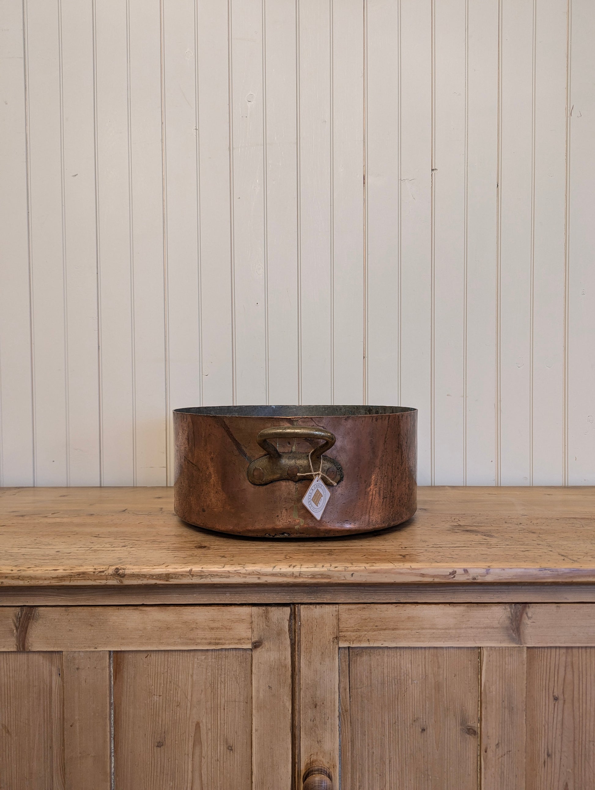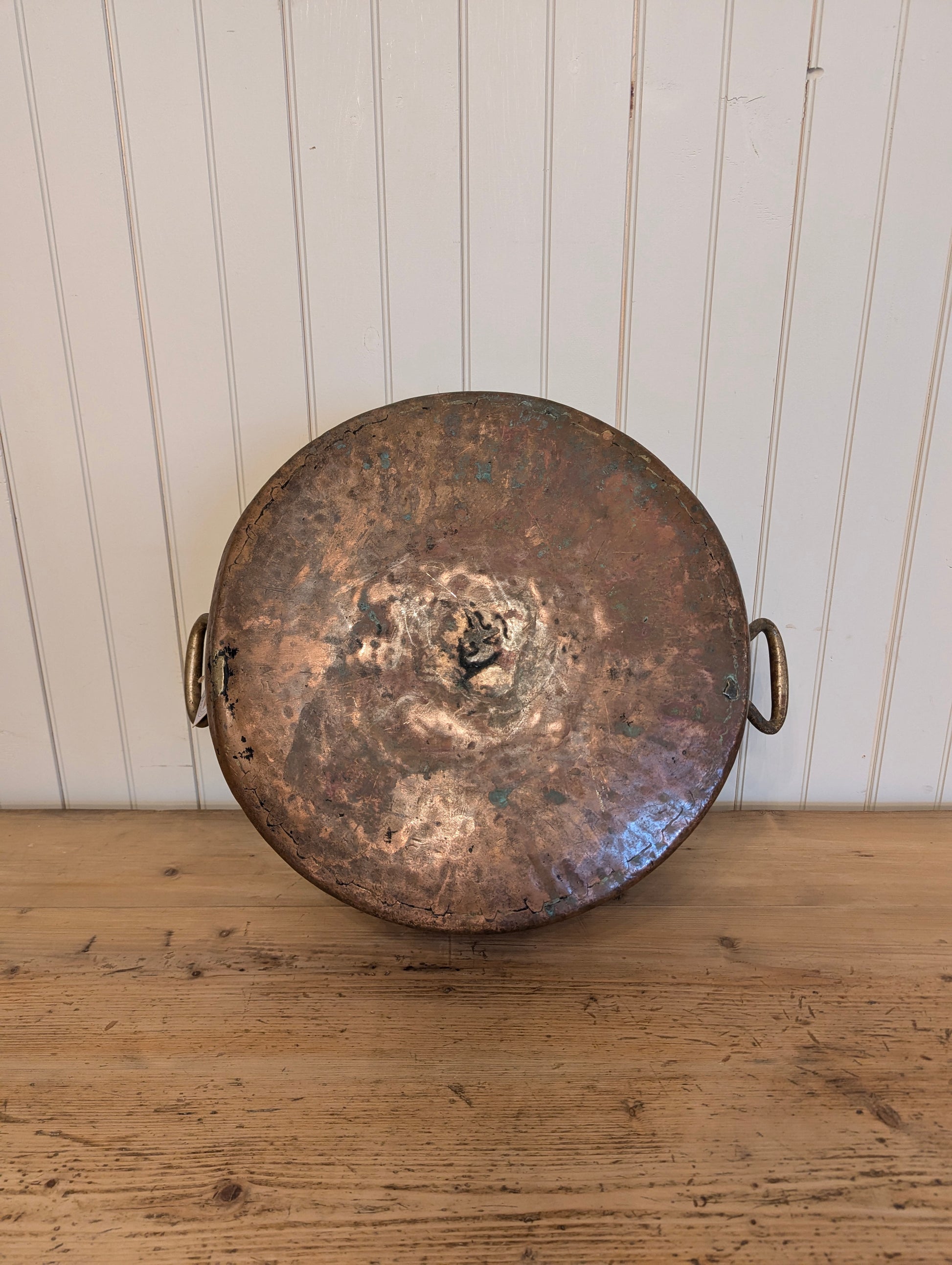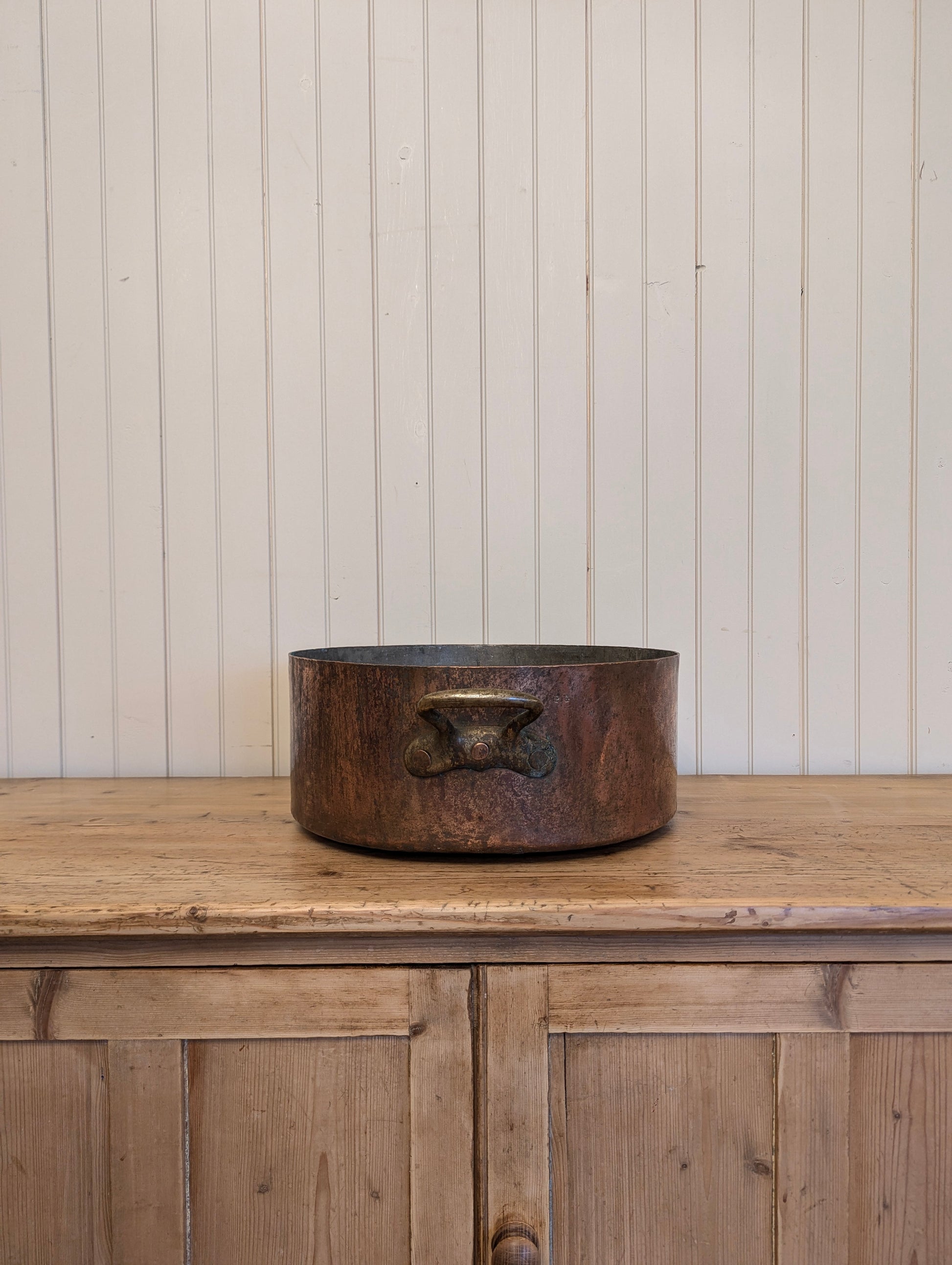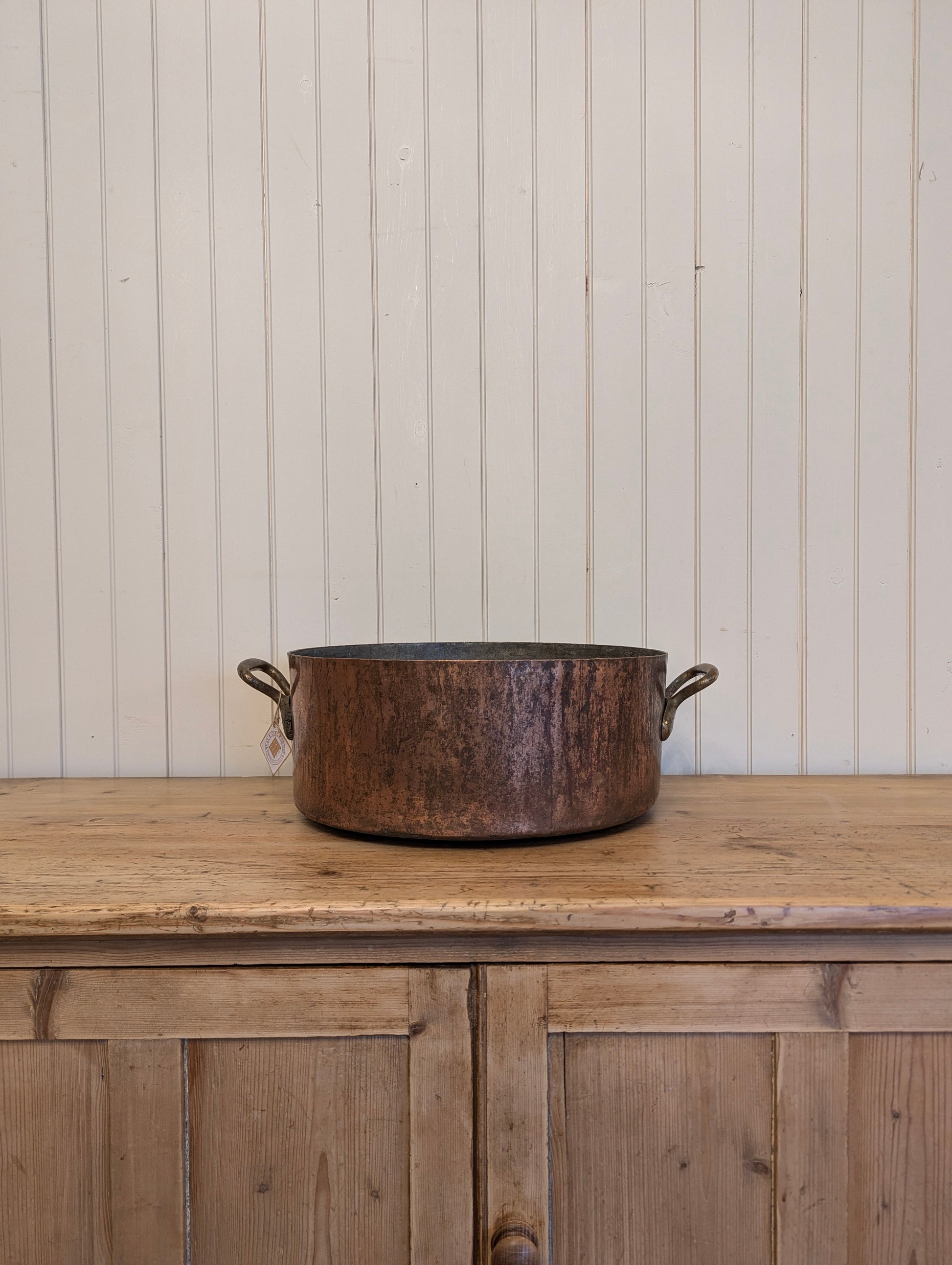 An exceptionally large French copper chefware pan. While it would have once has a lid, this pan now makes a stunning vessel for decorative use, or perched on a shelf/rack in the kitchen to add warmth. Right above the handle is the PG makers mark.