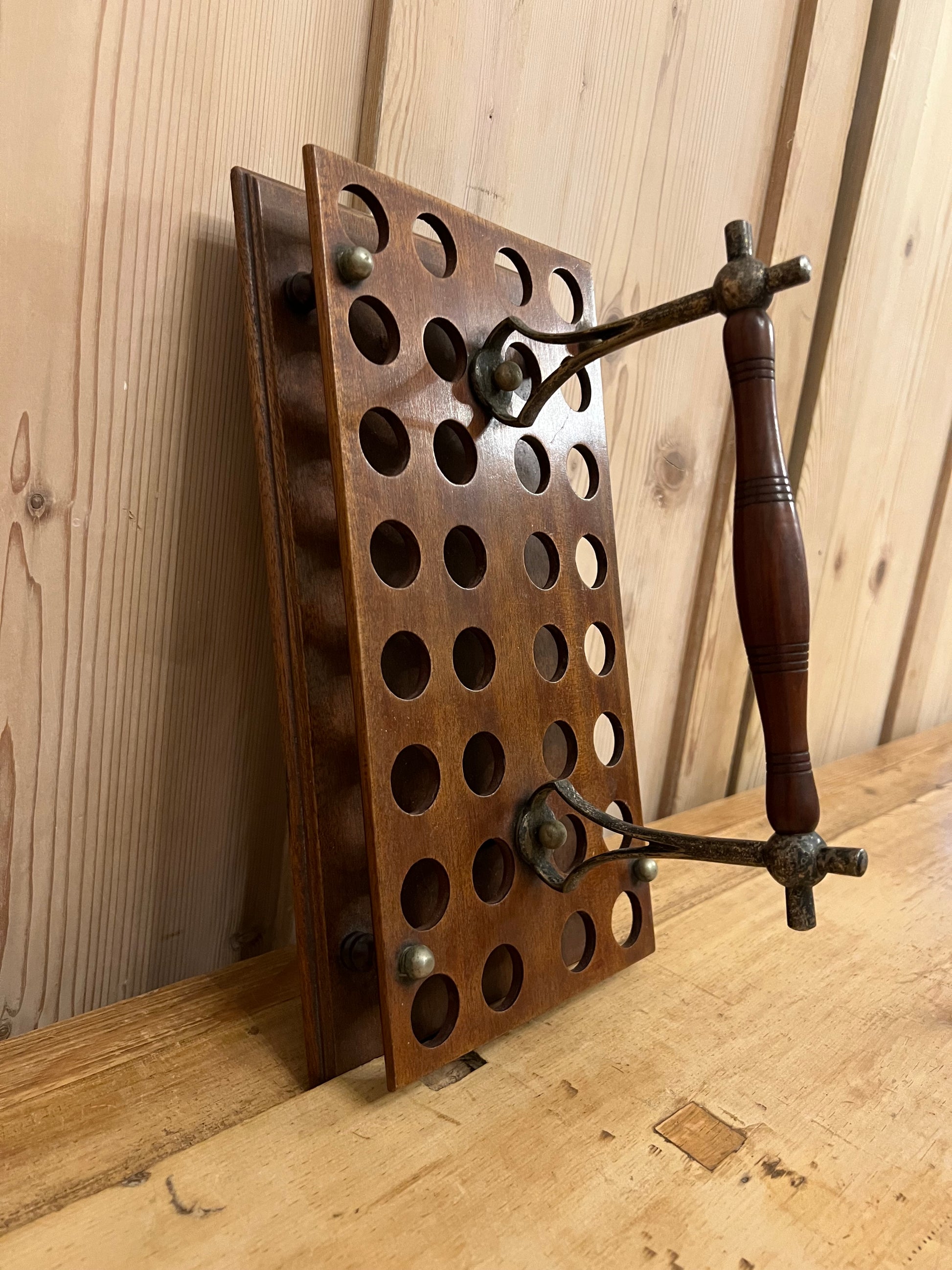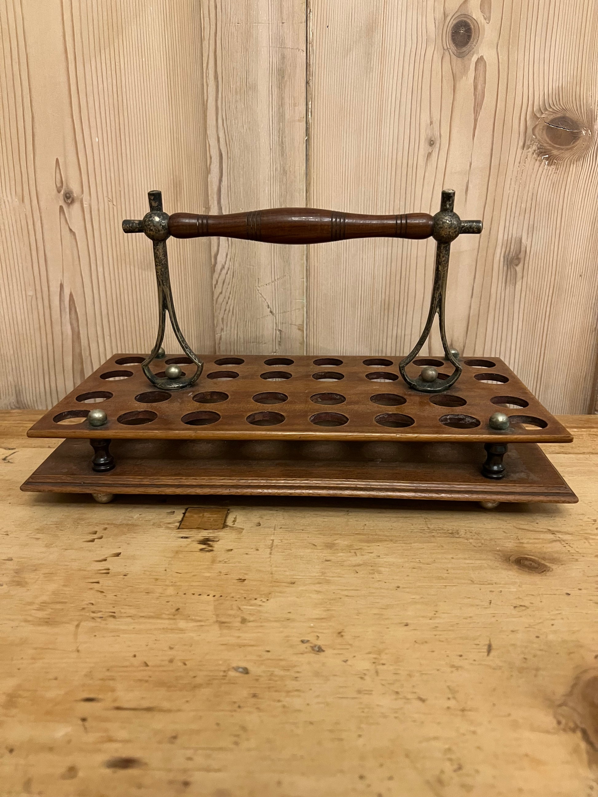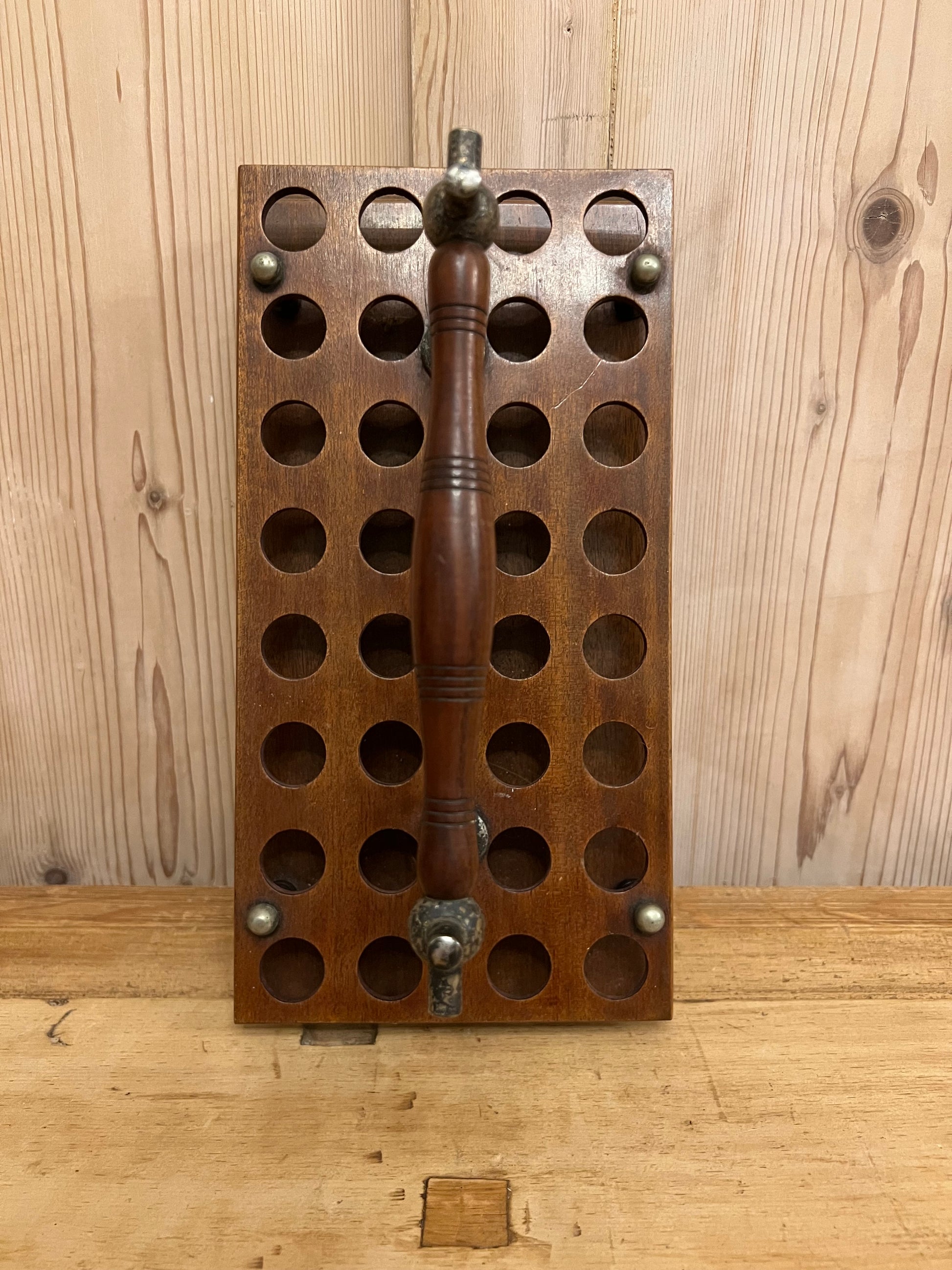 Comprised of oak and brass, this is an early 20th century communion wine holder. The back stamp indicates it was made in Birmingham, England.