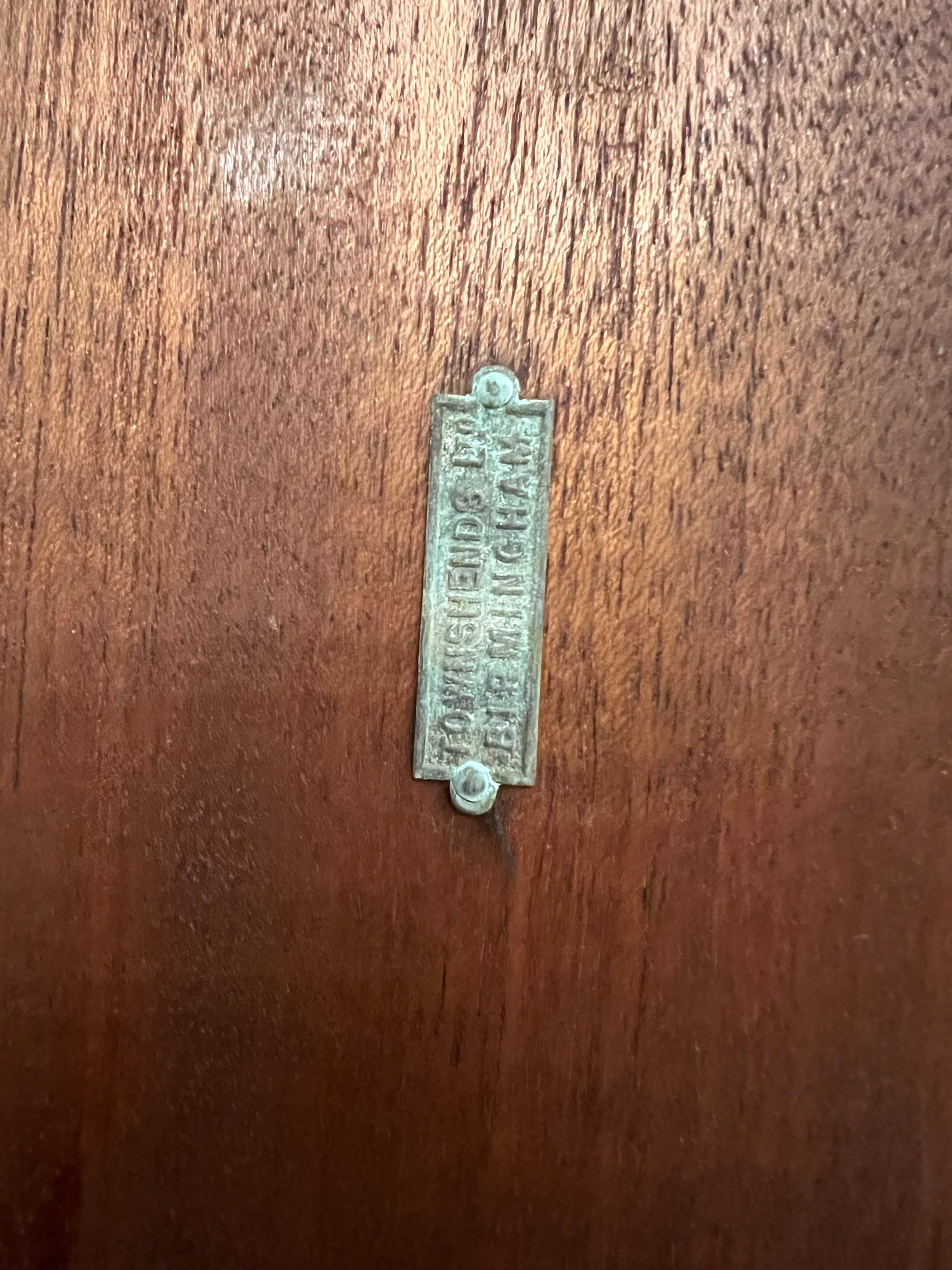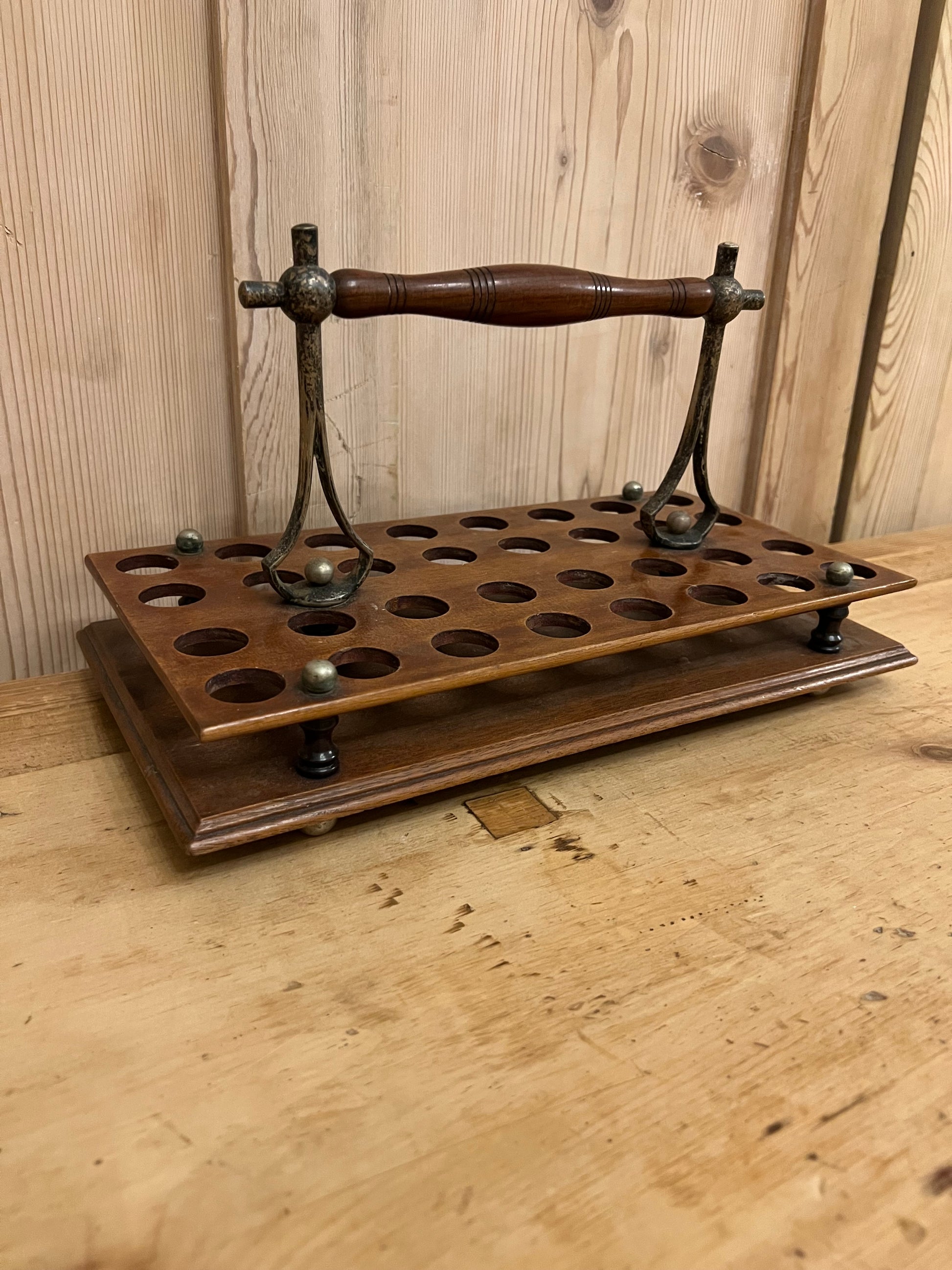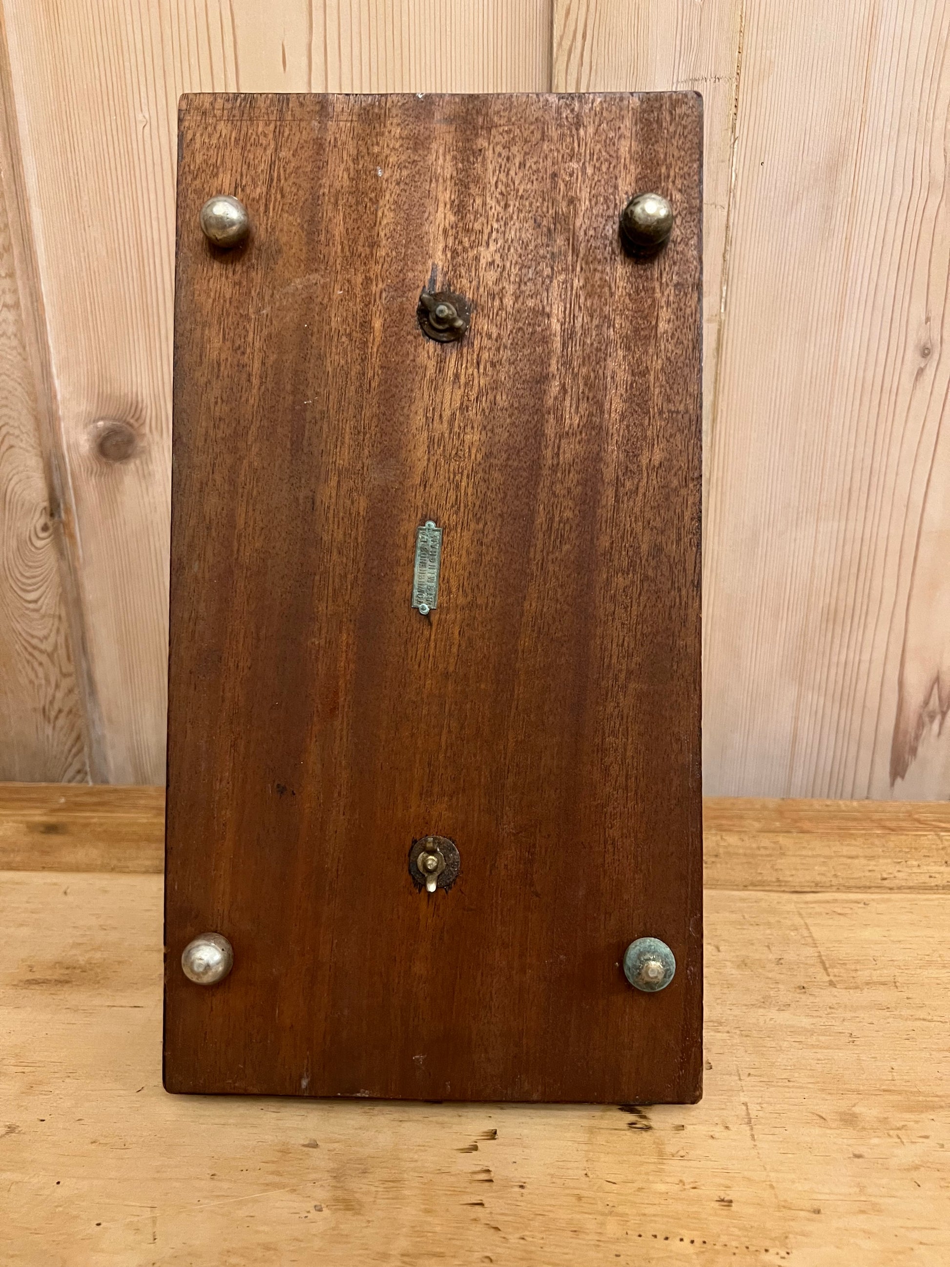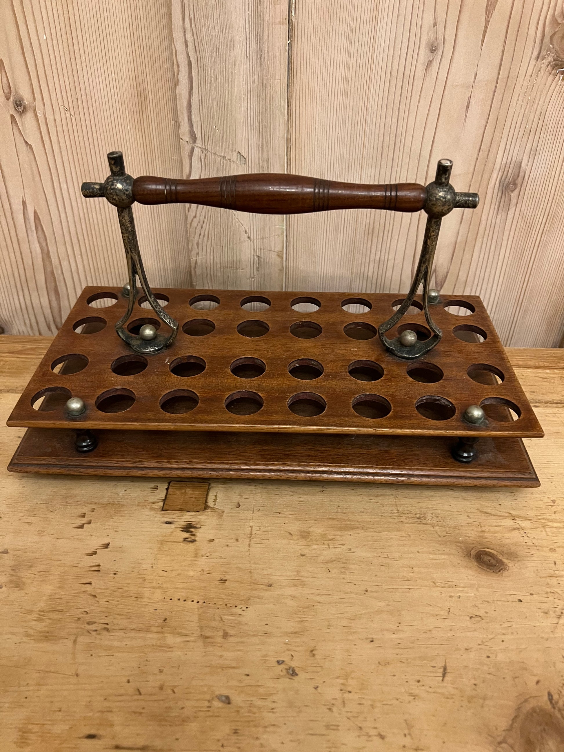 Comprised of oak and brass, this is an early 20th century communion wine holder. The back stamp indicates it was made in Birmingham, England.
