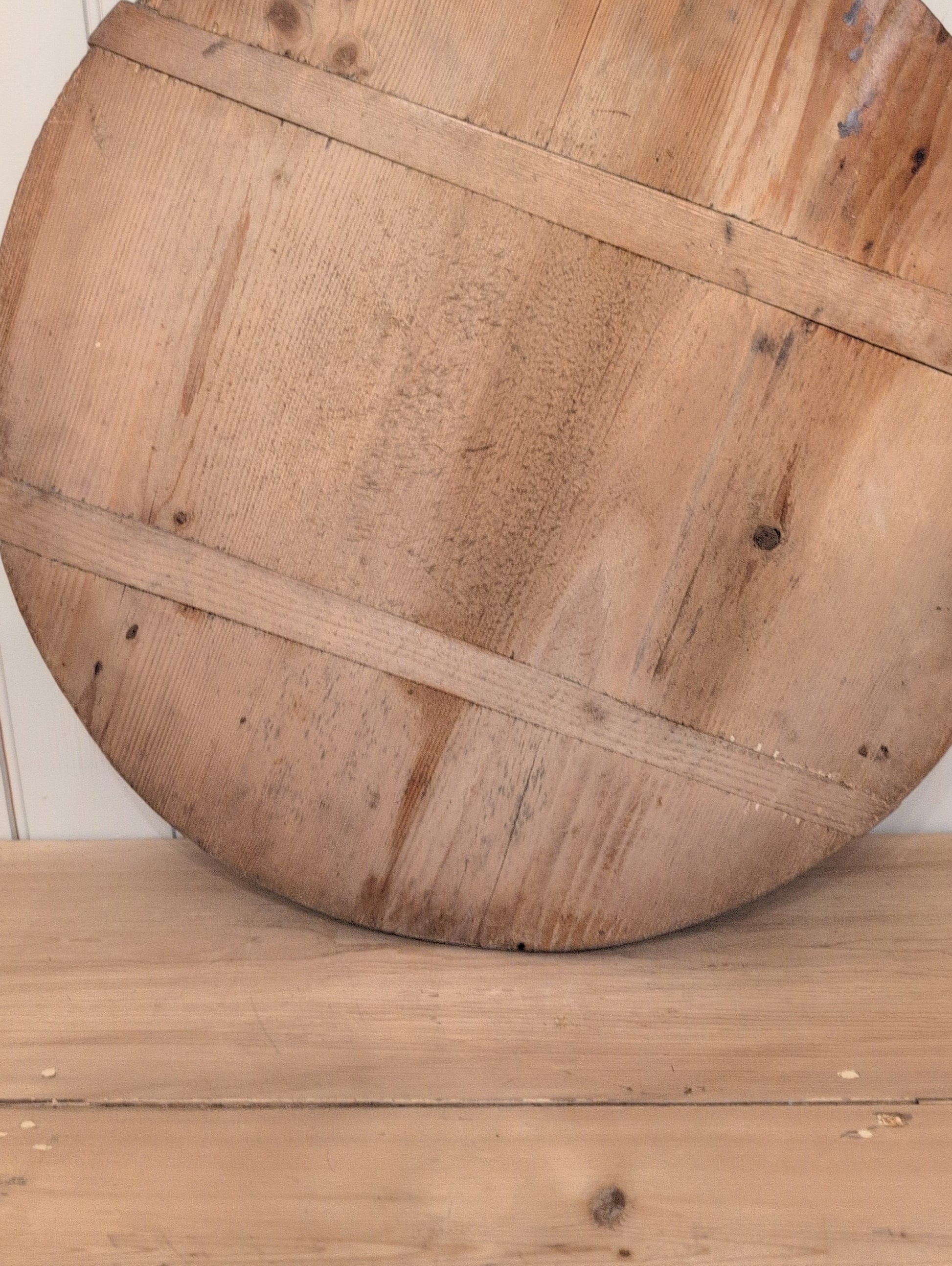 Sourced in England, this round breadboard has a rich warm coloring to it. This is practical for every day use in the kitchen or as an island trivet.