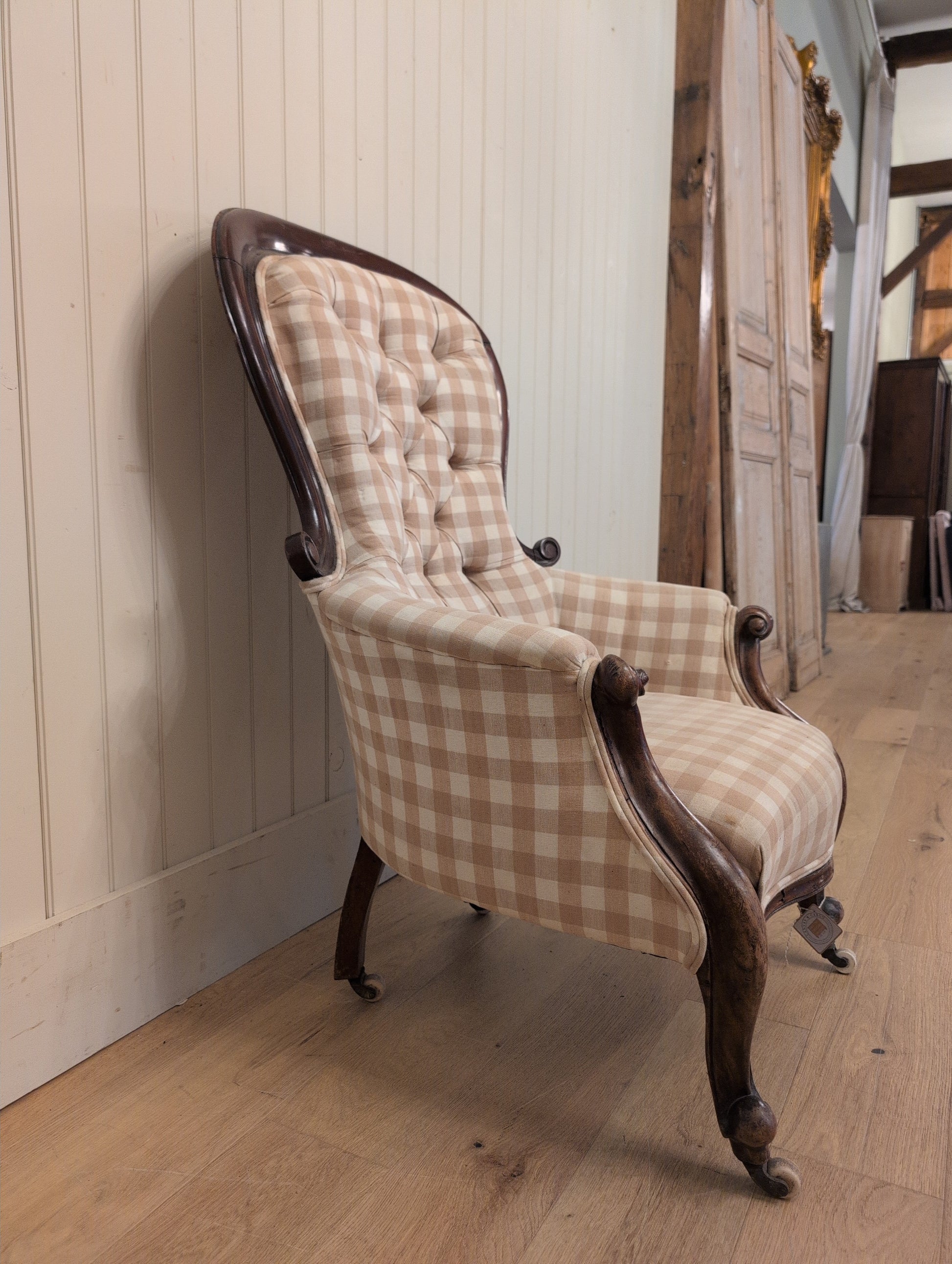 From the Victorian era, this English nursing chair has a classically designed frame. We love the vintage gingham fabric. Please note there are minor spots of wear/staining on the fabric consistent with the age of the piece. Please review photos carefully. The frame is sturdy and structurally sound. It can be used as is and is comfortable to sit in.