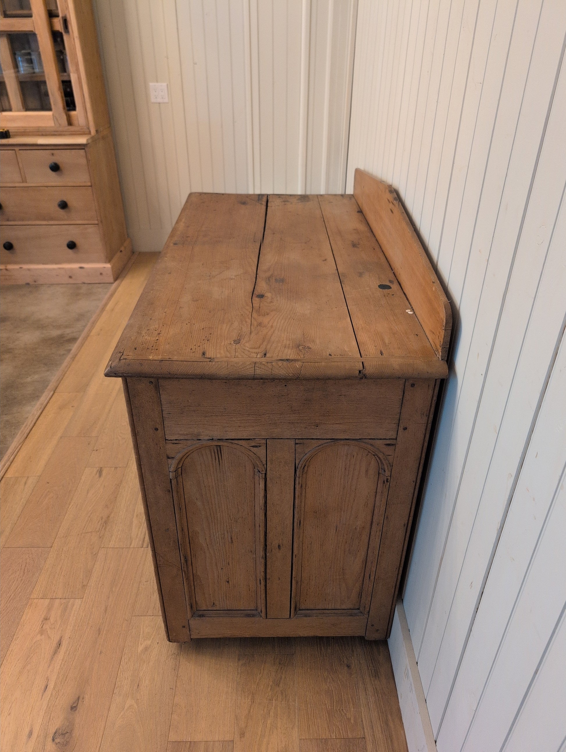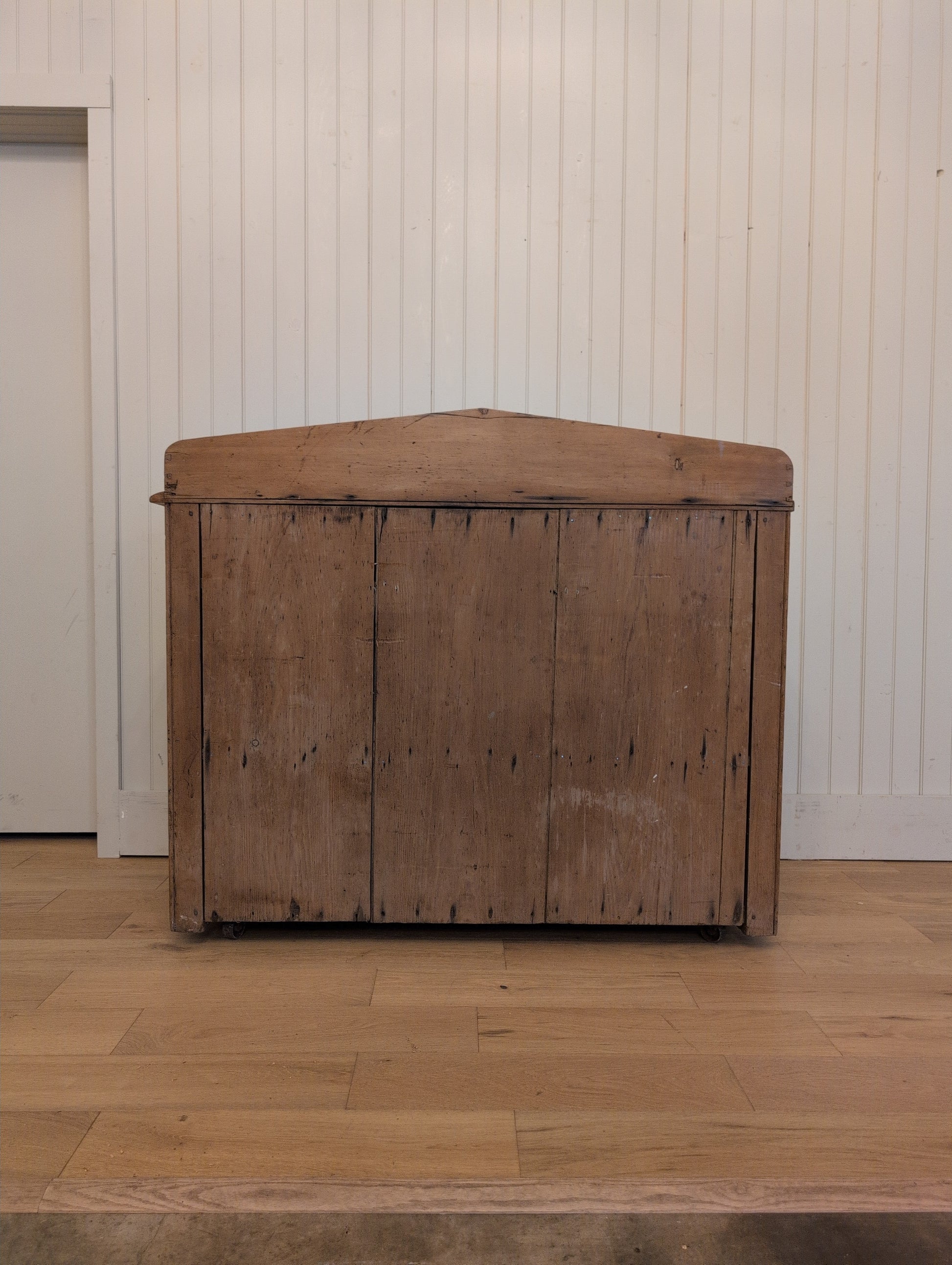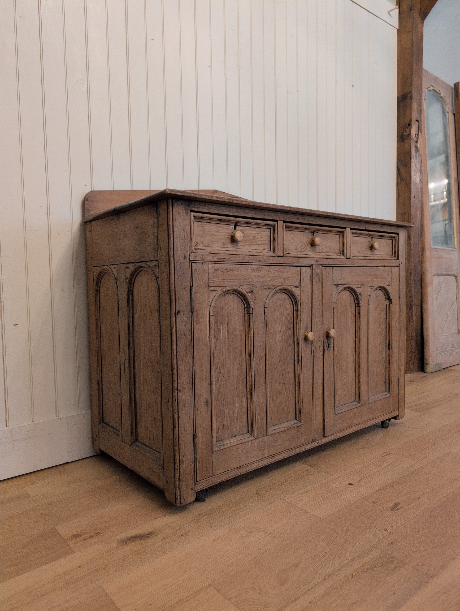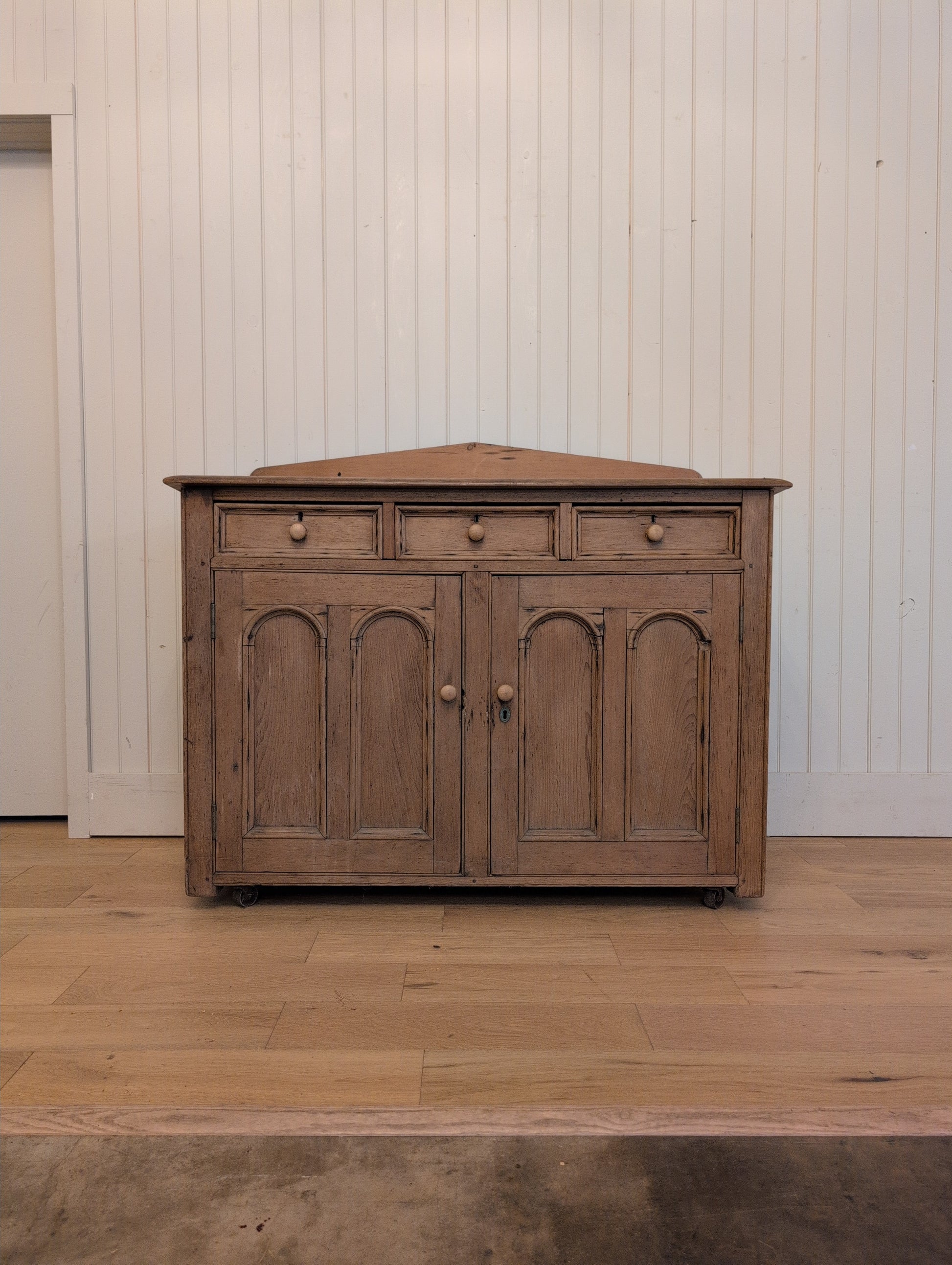 From a church outside of Southampton, this English pine sideboard is quite oversized. We appreciate the repeating pattern of arches on the doors and sides, giving it a finished and cohesive feel. The finish is entirely waxed and has a warm medium brown nutty color. The depth of this piece makes it an easy option for a kitchen island, or in the media room for extra storage. There are old casters on the underneath adding to the height of the piece. They can be removed should you choose to. Please note the patina and wear throughout the piece, as is appropriate with the age of the piece.