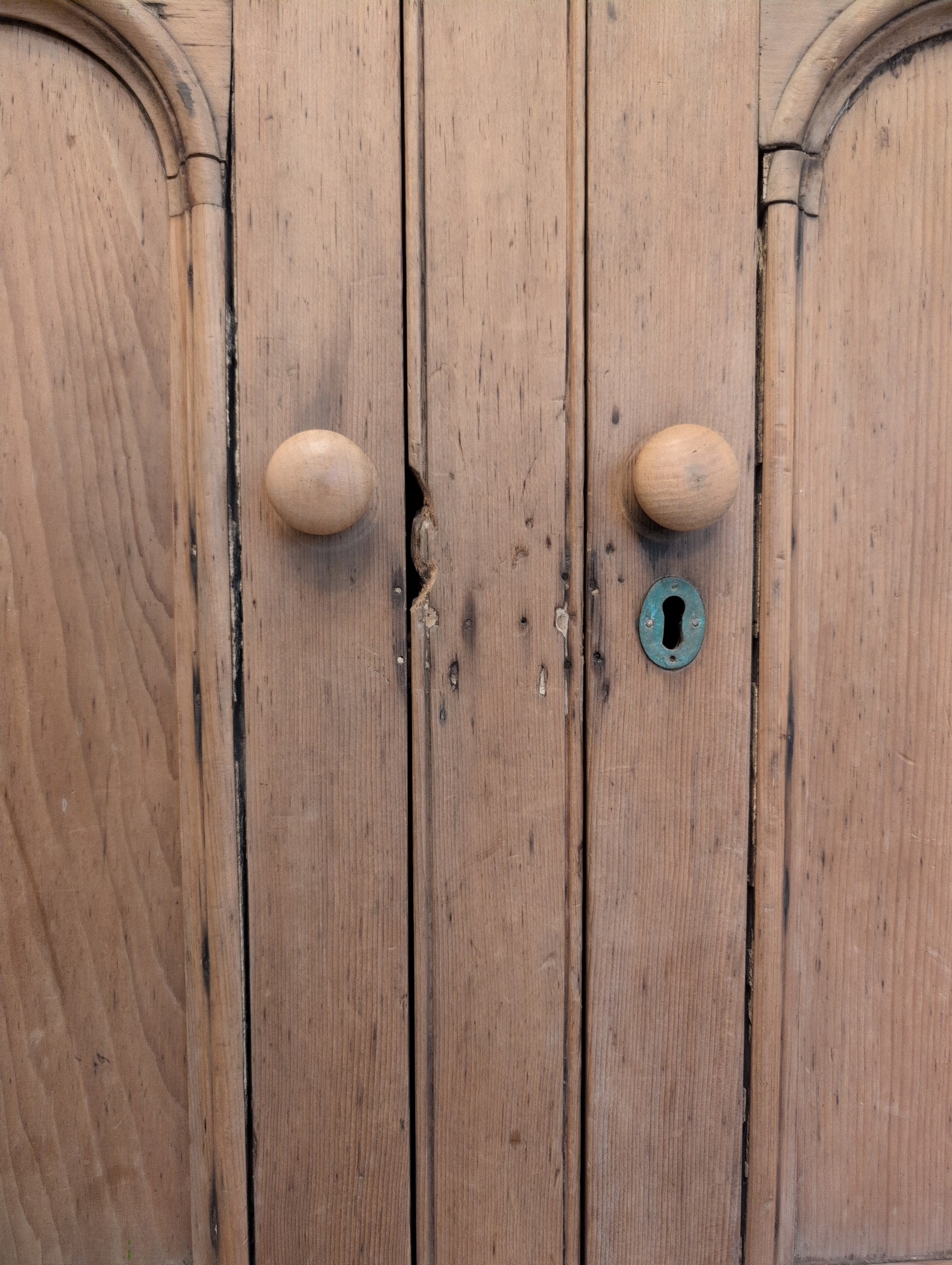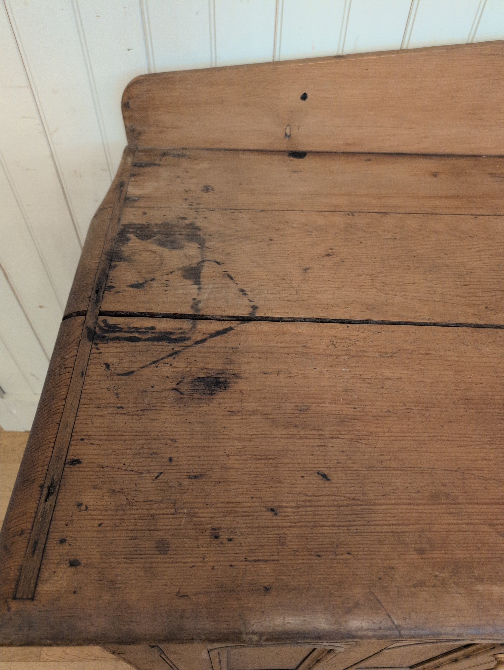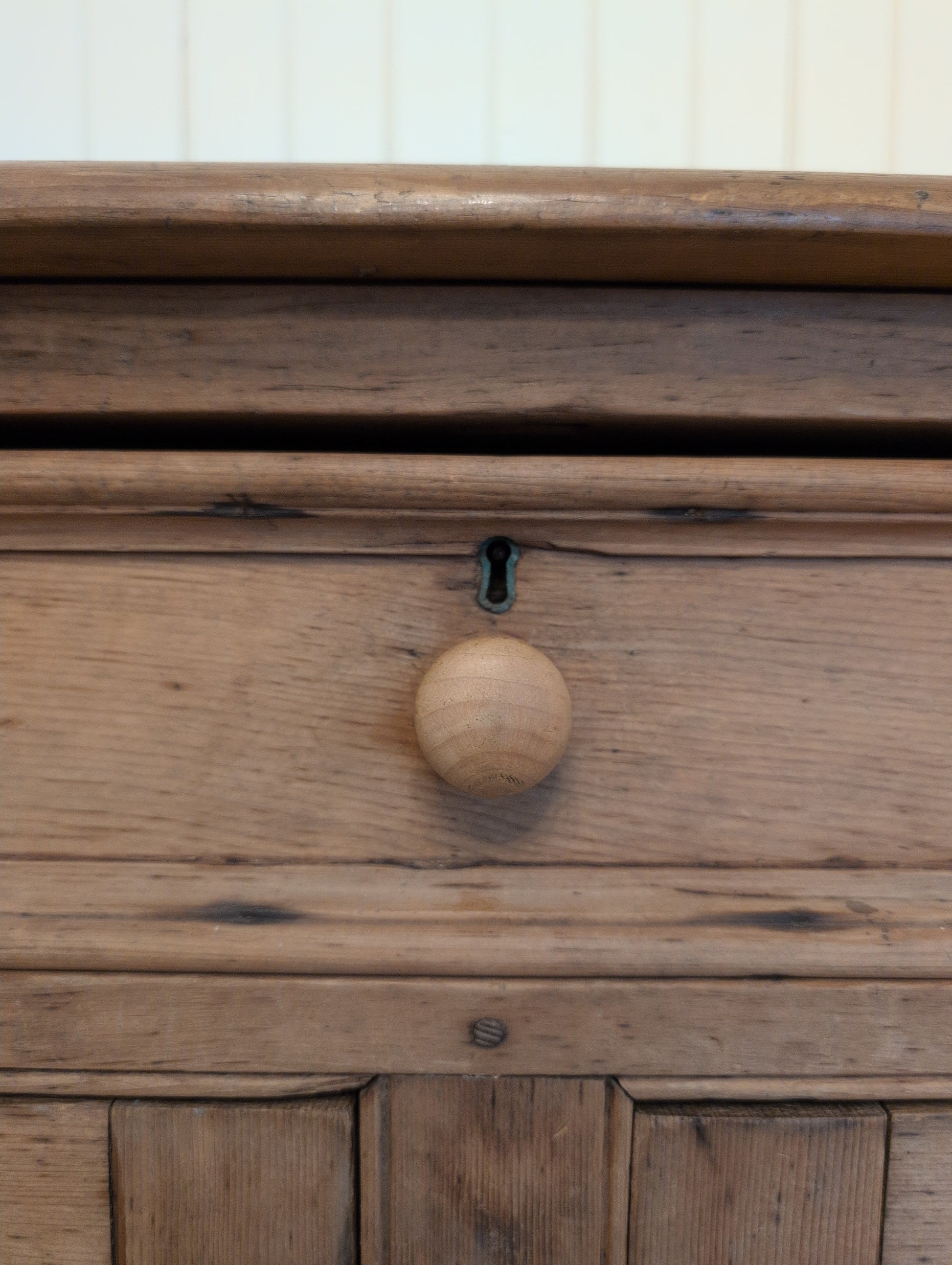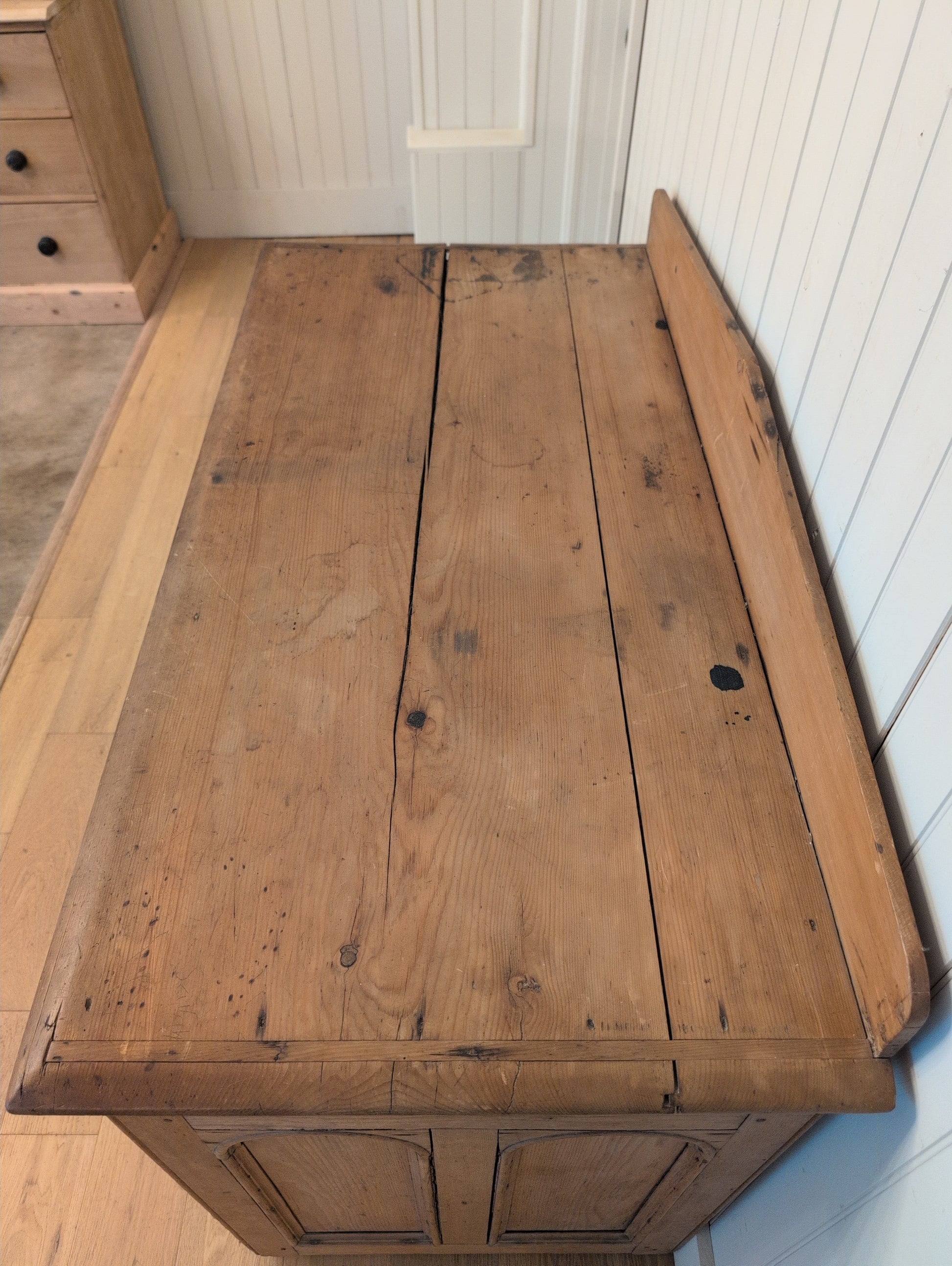 From a church outside of Southampton, this English pine sideboard is quite oversized. We appreciate the repeating pattern of arches on the doors and sides, giving it a finished and cohesive feel. The finish is entirely waxed and has a warm medium brown nutty color. The depth of this piece makes it an easy option for a kitchen island, or in the media room for extra storage. There are old casters on the underneath adding to the height of the piece. They can be removed should you choose to. Please note the patina and wear throughout the piece, as is appropriate with the age of the piece.