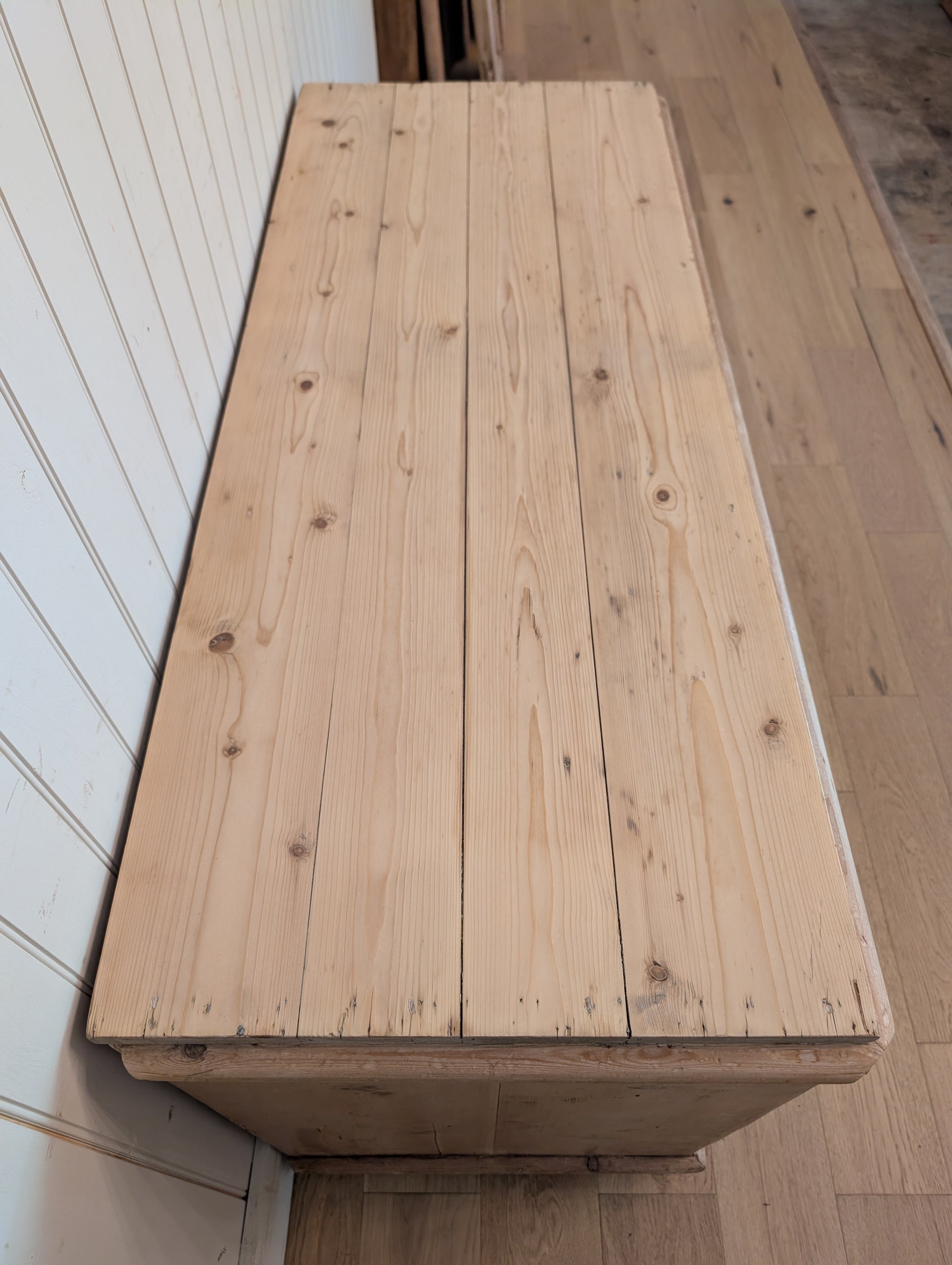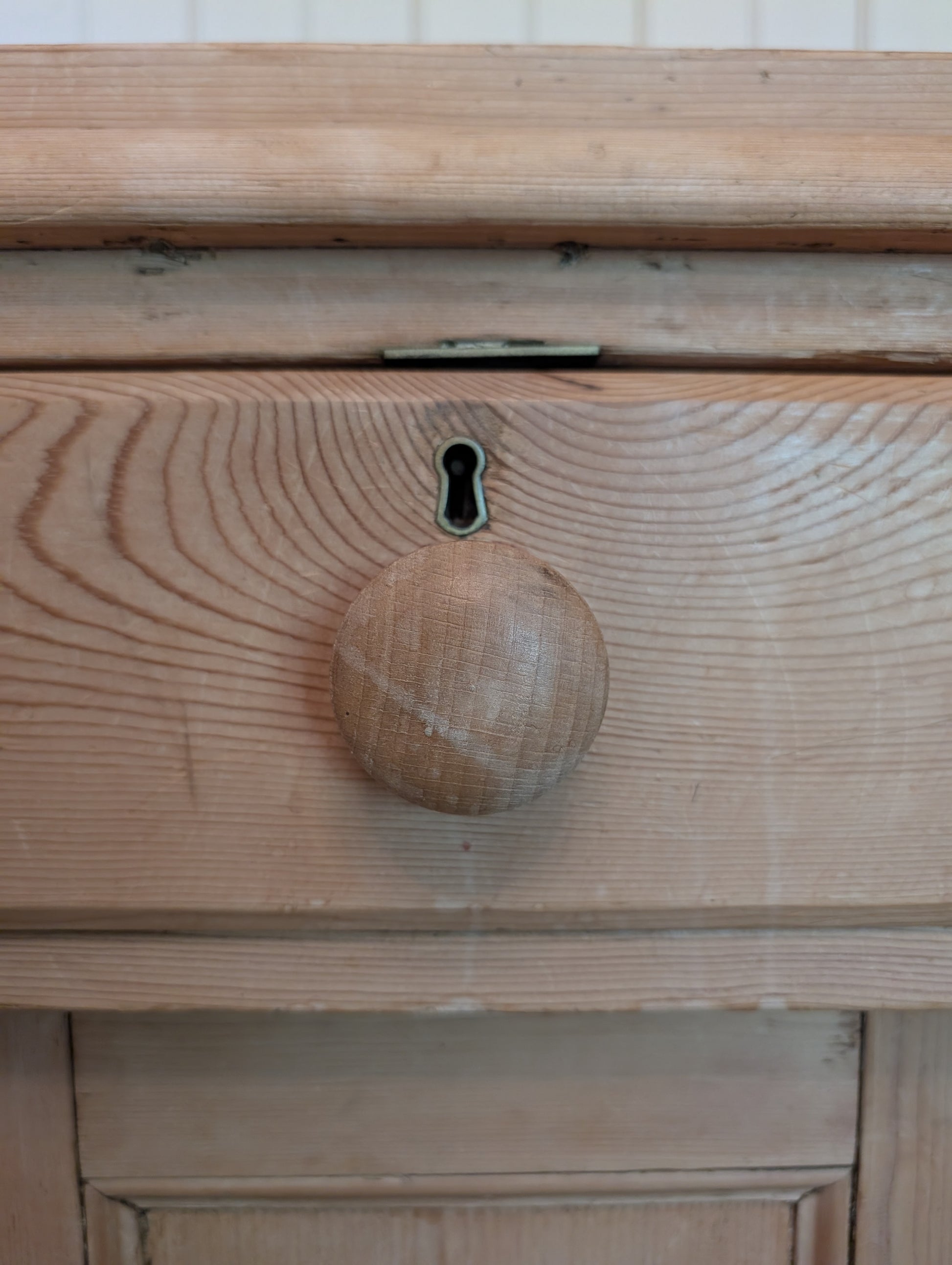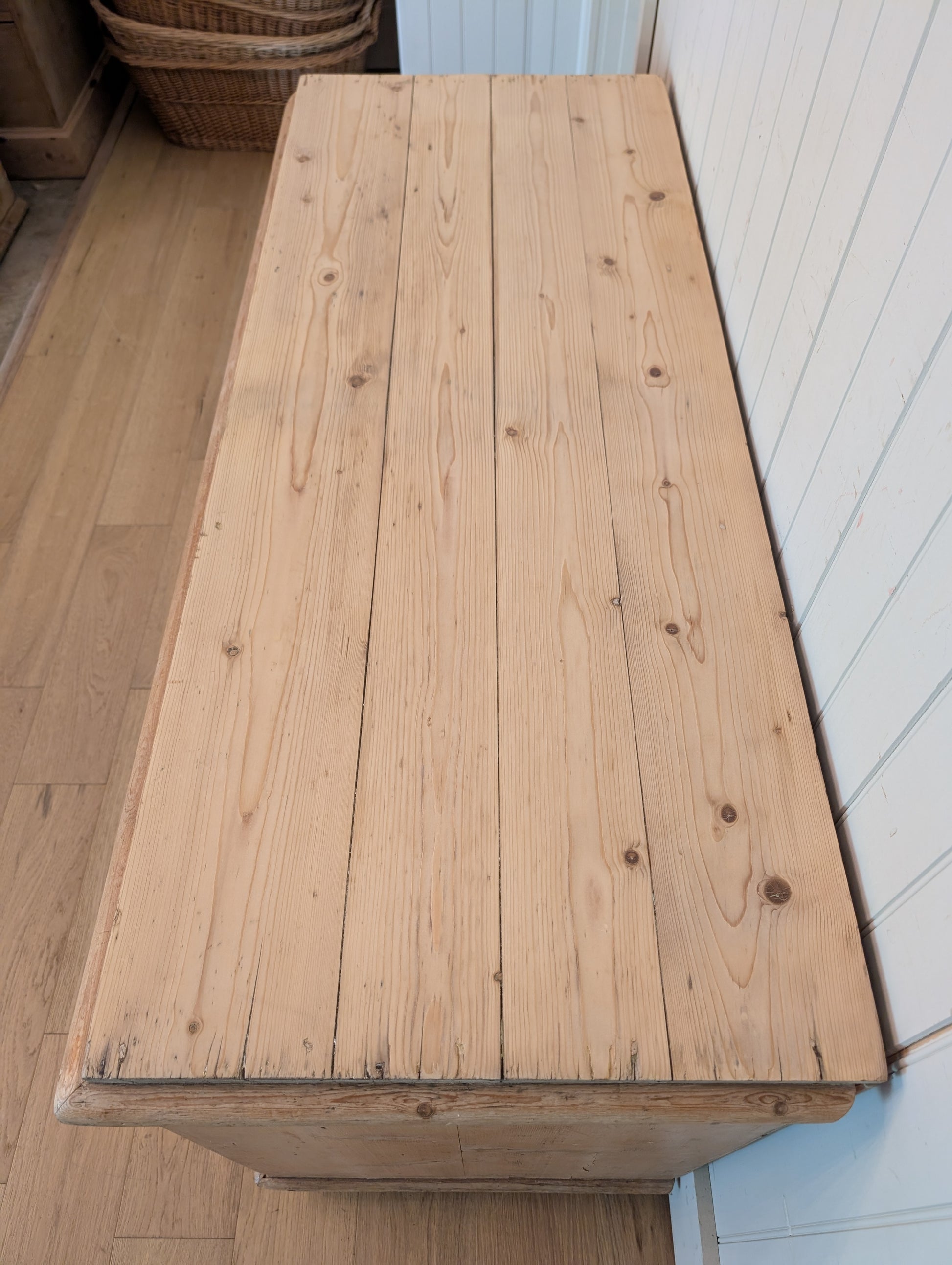 A lightly colored English pine sideboard. This piece is entirely waxed with the top being slightly lighter than the base in color. There are seven smooth gliding drawers, all of which have the original wooden hardware. The joinery is hand cut on the drawers, further highlighting the craftsmanship of the Victorian Era (1837-1901).