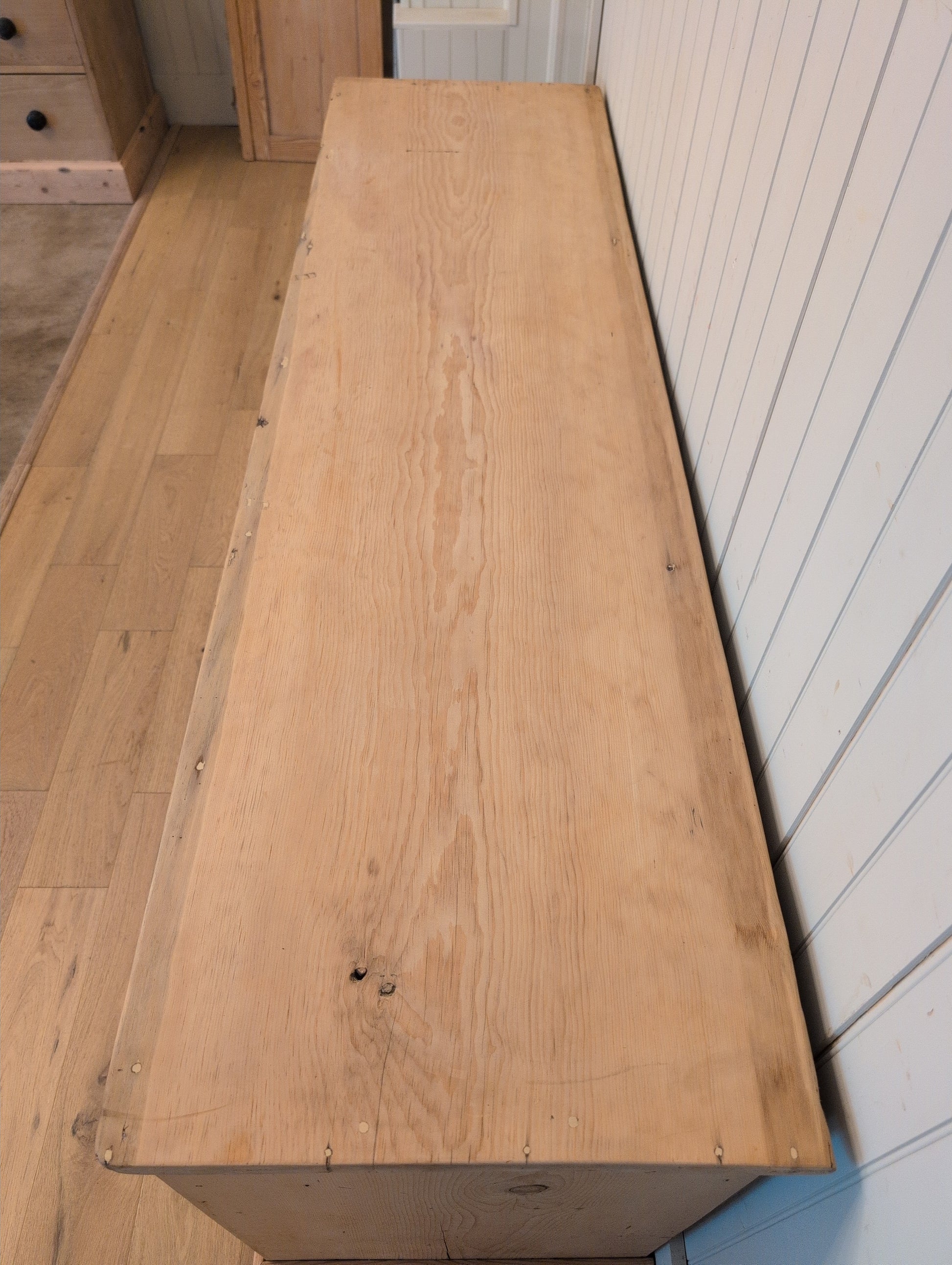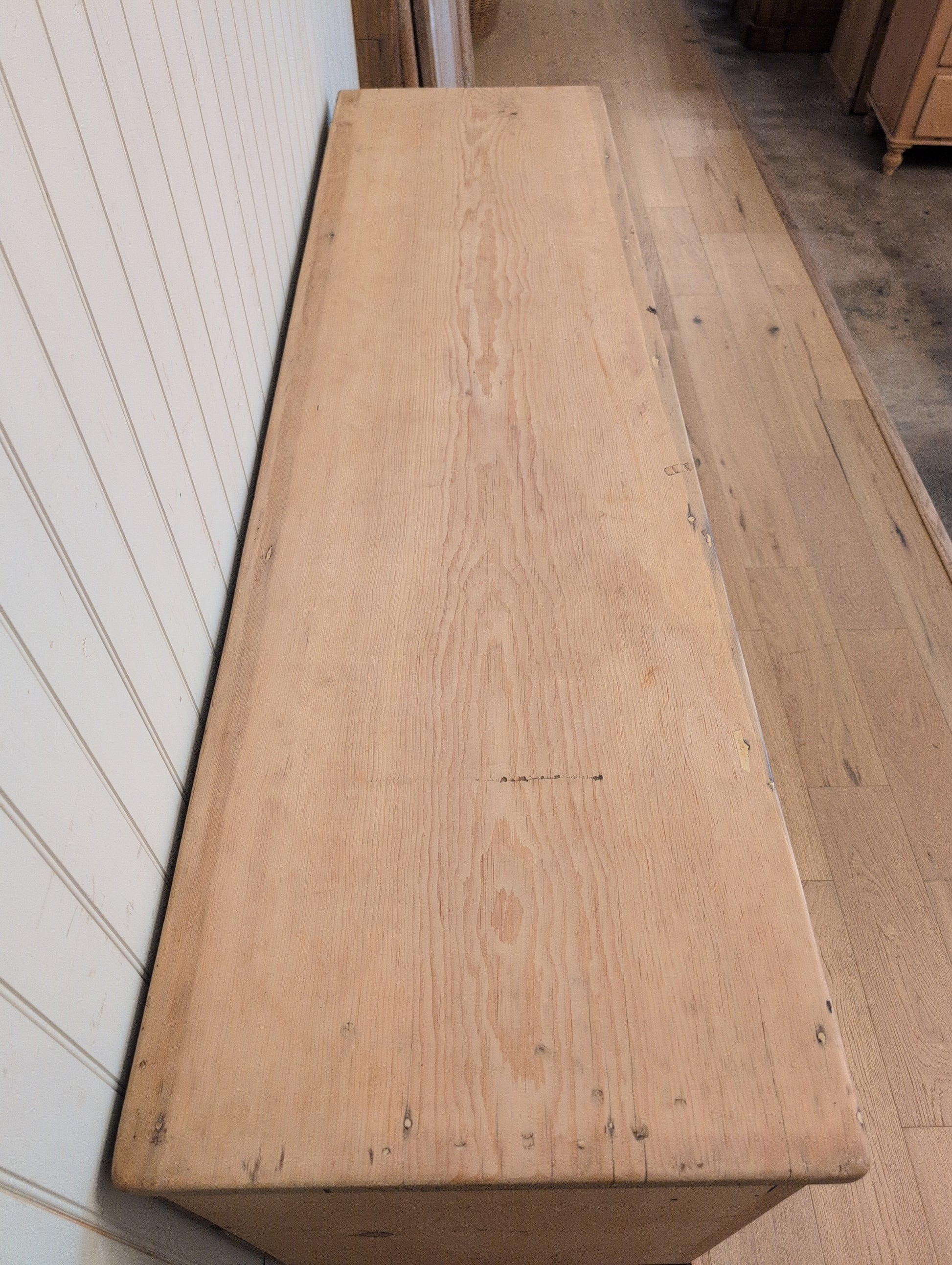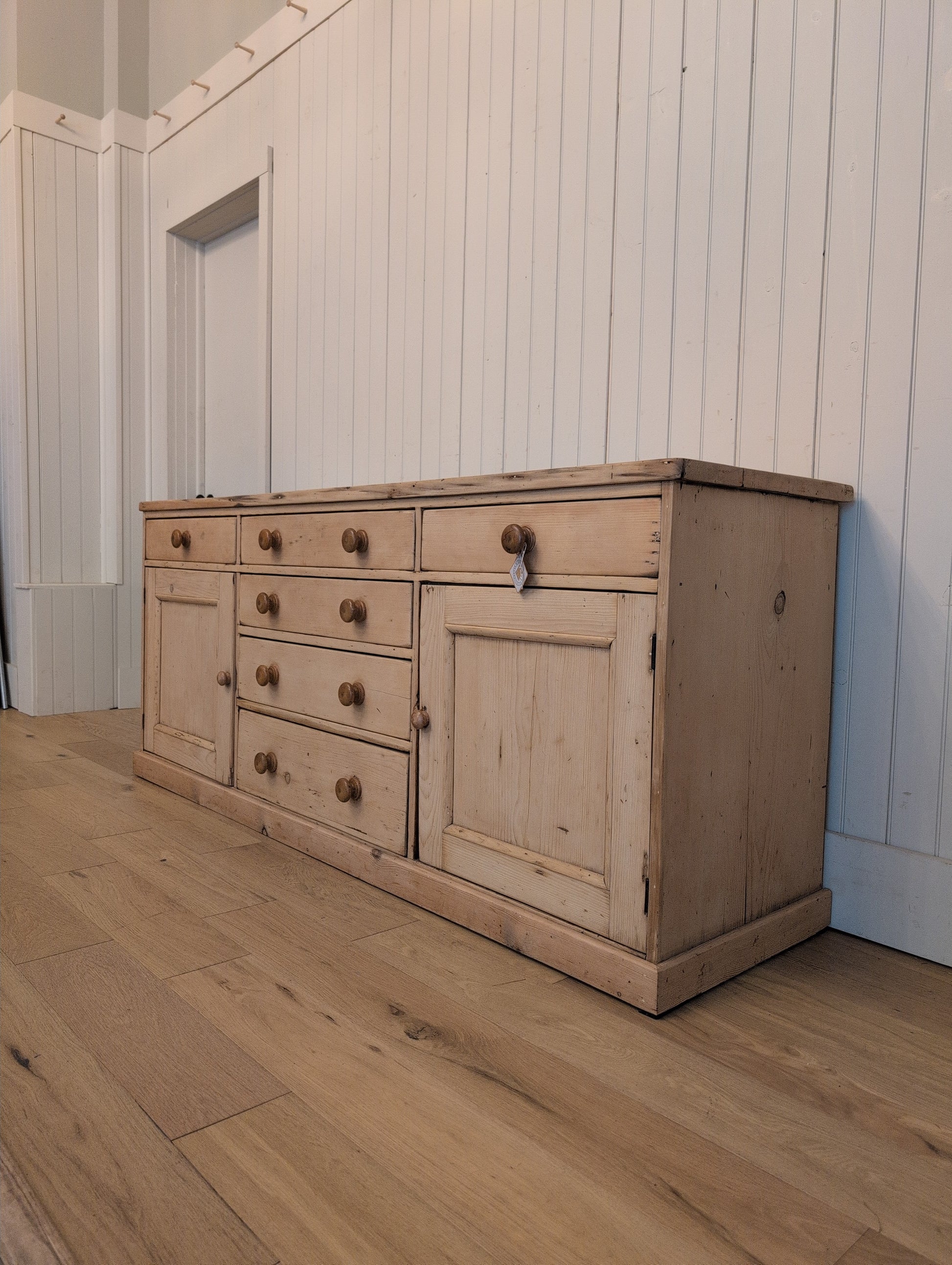 A nearly 7ft long English pine sideboard. Fully stripped down and re-waxed in a clear coat, there are no yellow or orange undertones on this piece. We love the original wooden knob hardware that is a medium brown color. The 6 smooth gliding drawers offer excellent organization. They are all hand cut dovetail construction.