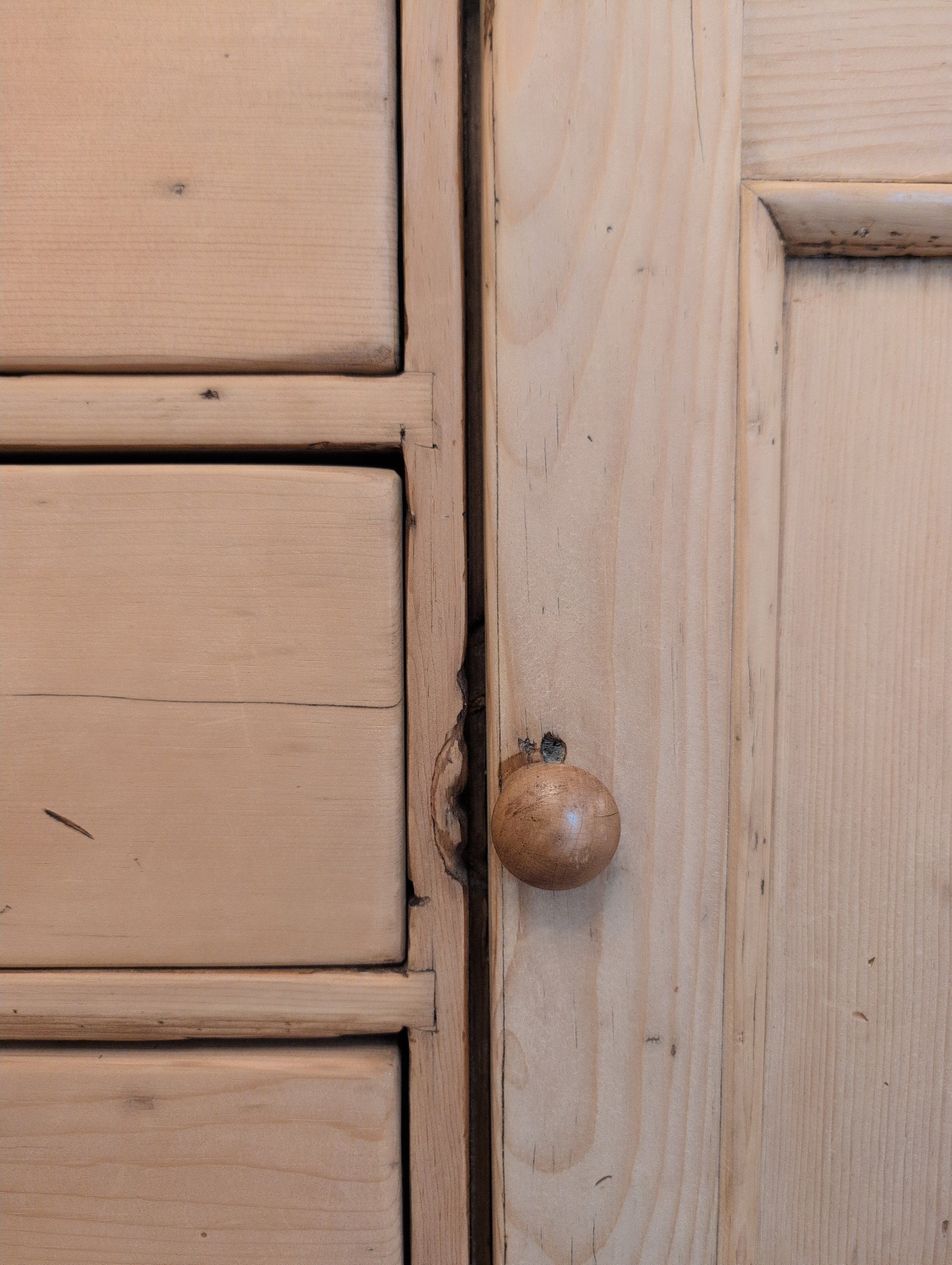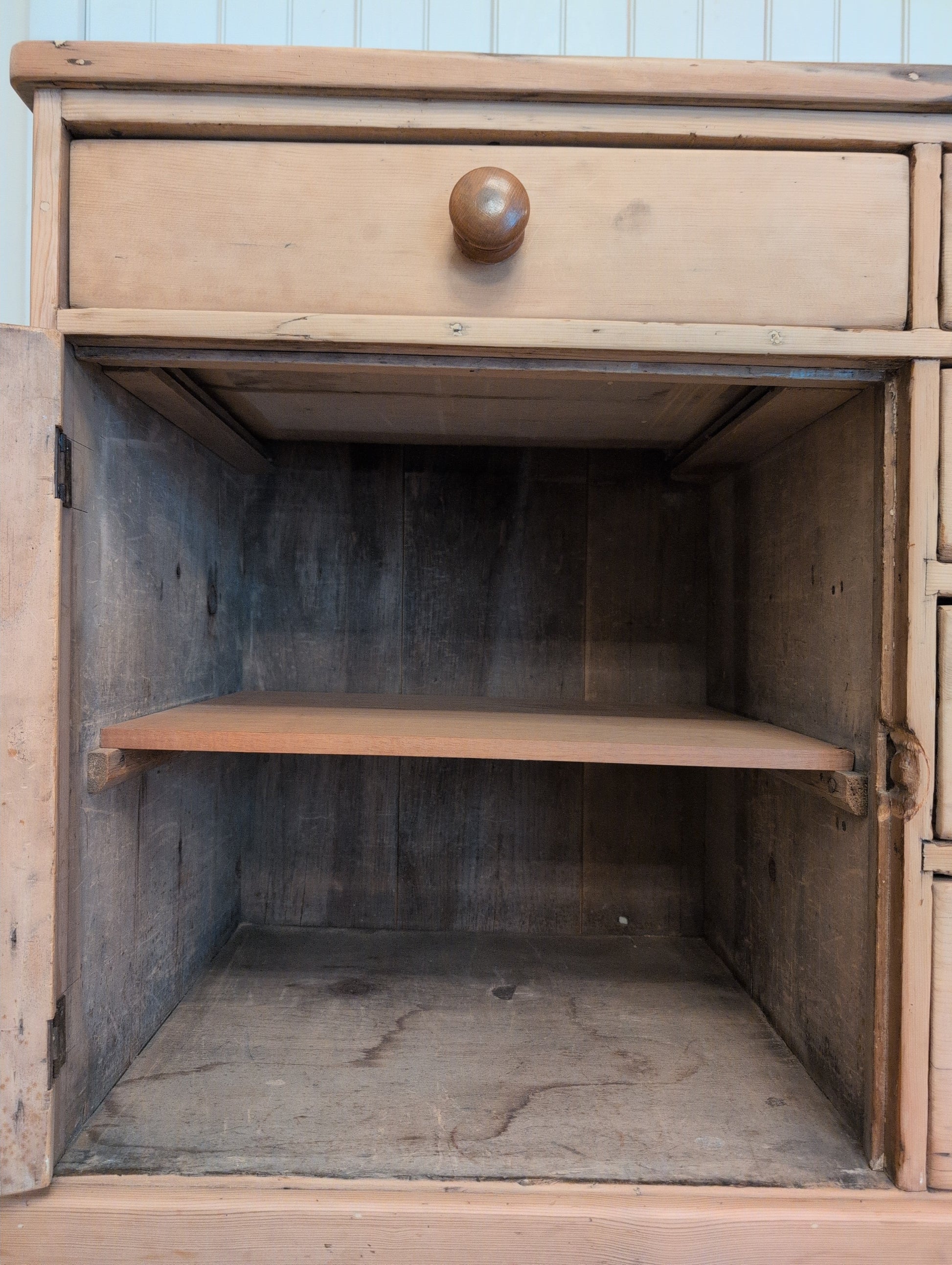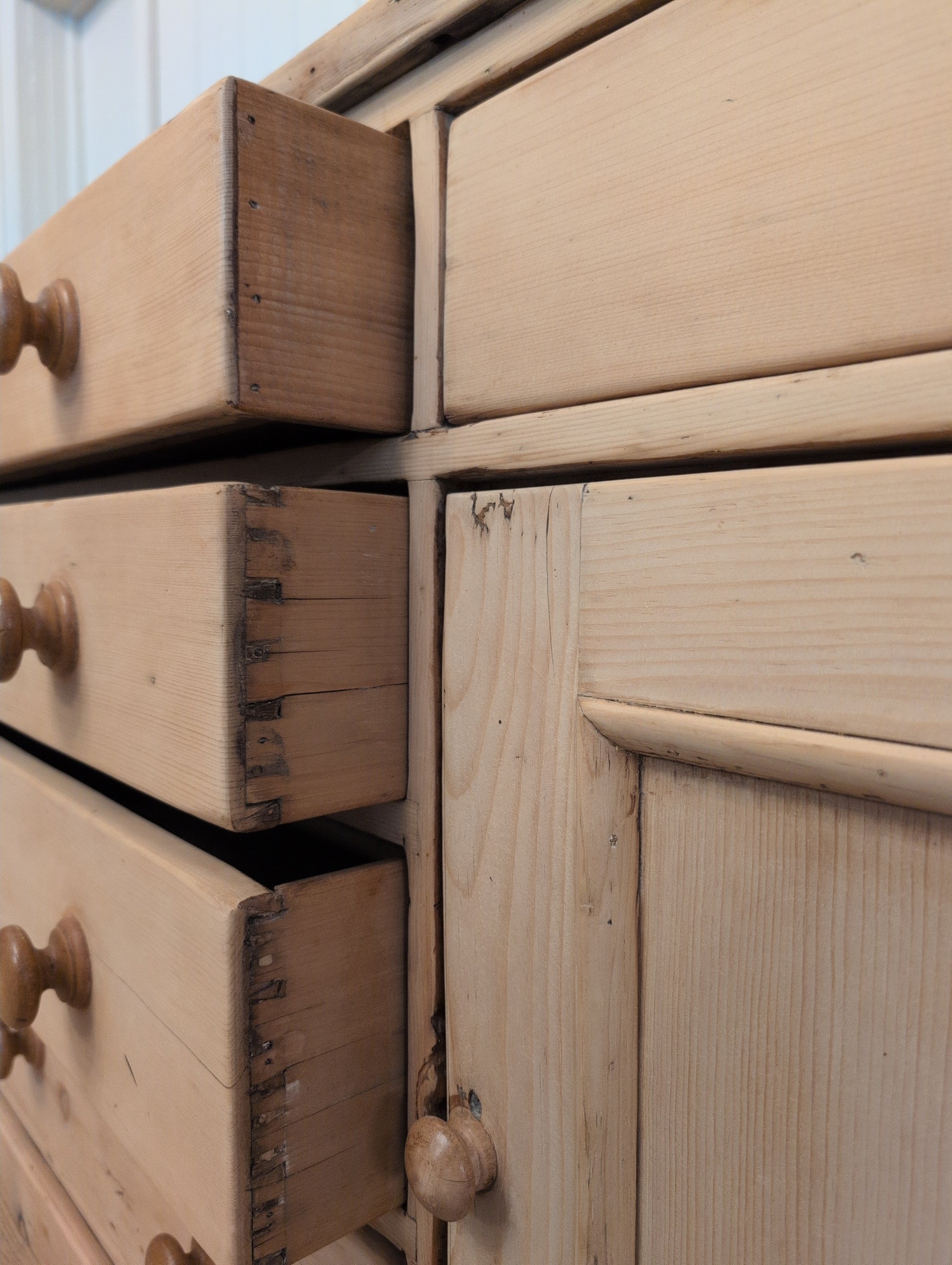 A nearly 7ft long English pine sideboard. Fully stripped down and re-waxed in a clear coat, there are no yellow or orange undertones on this piece. We love the original wooden knob hardware that is a medium brown color. The 6 smooth gliding drawers offer excellent organization. They are all hand cut dovetail construction.
