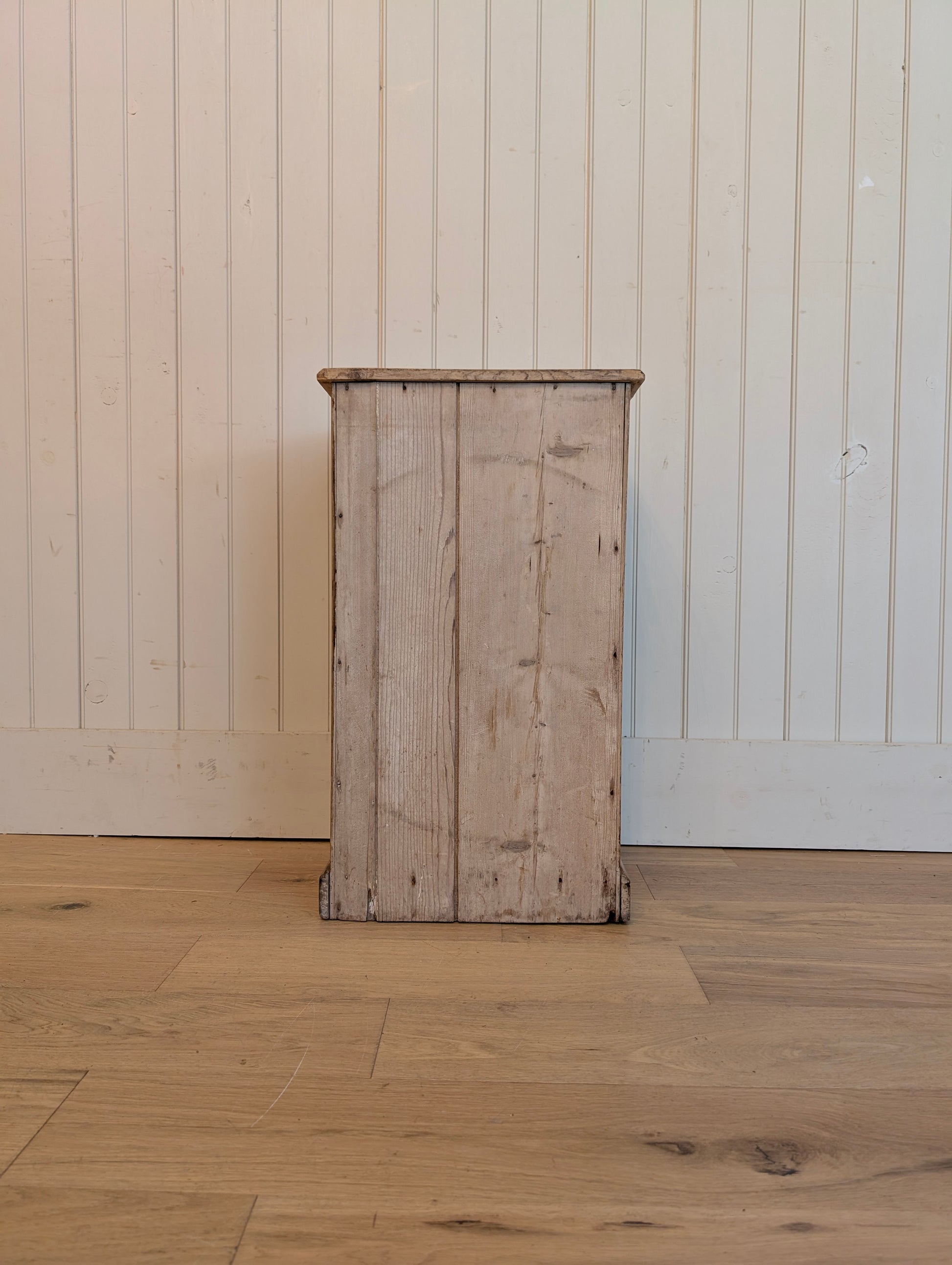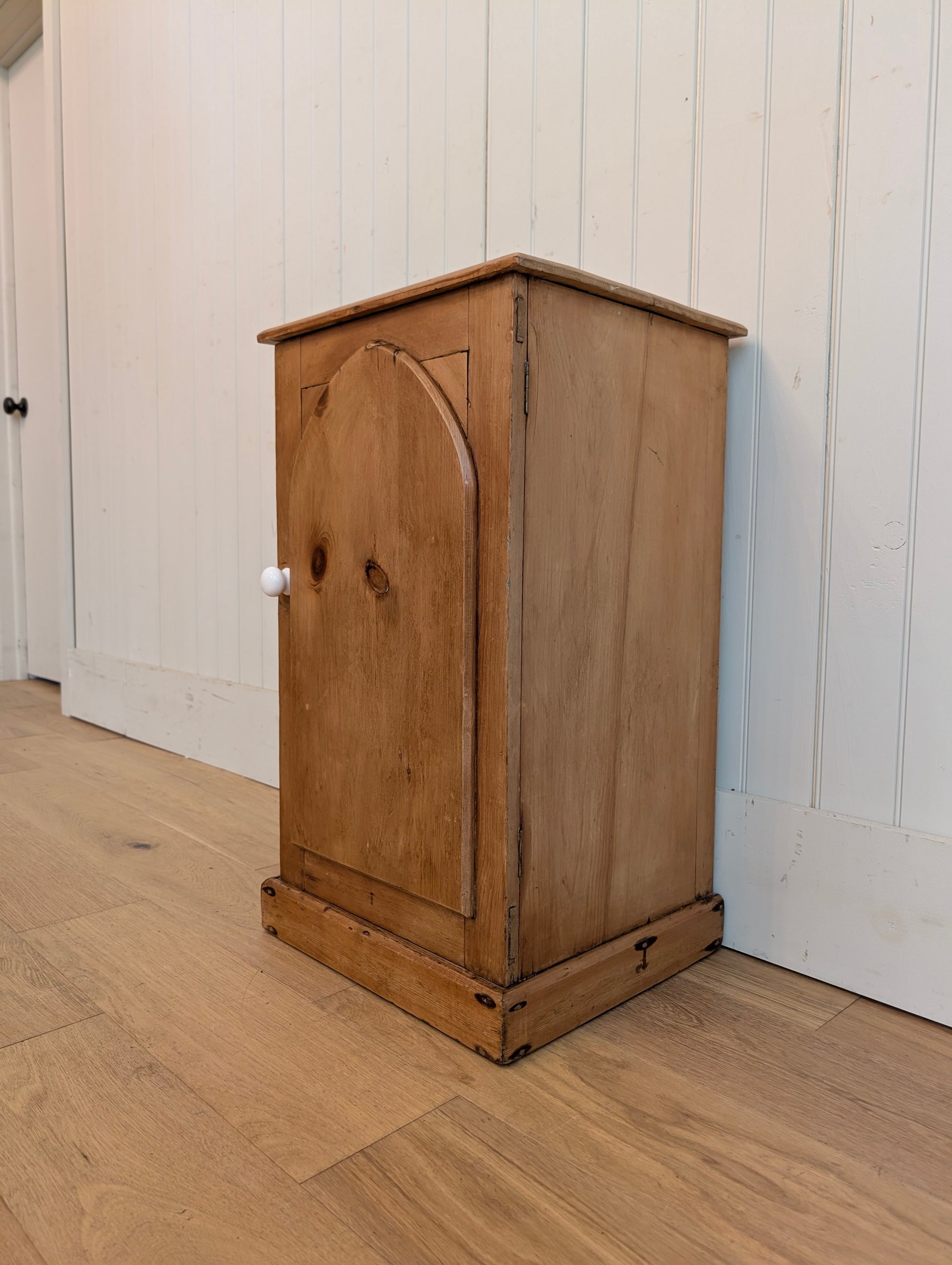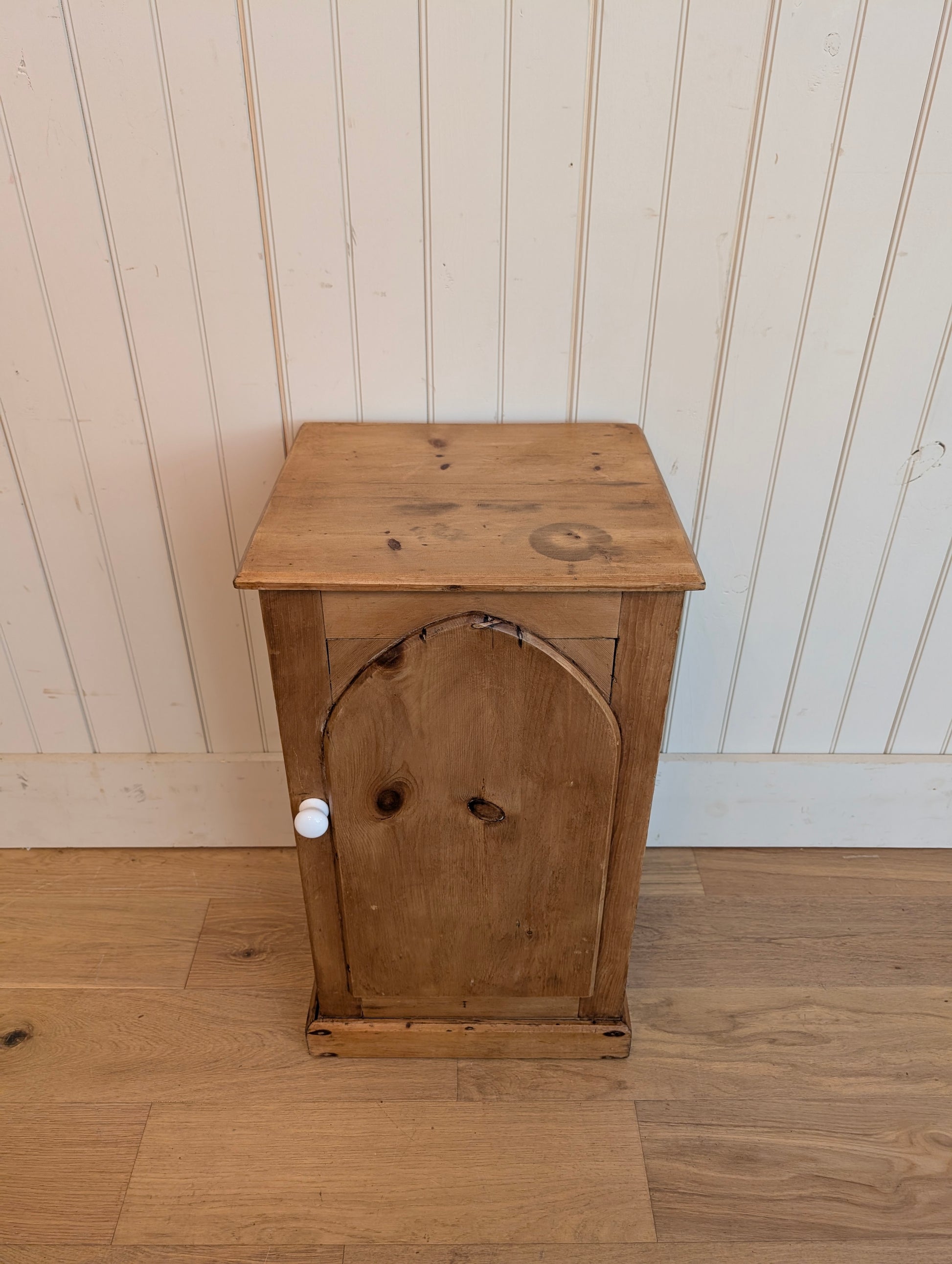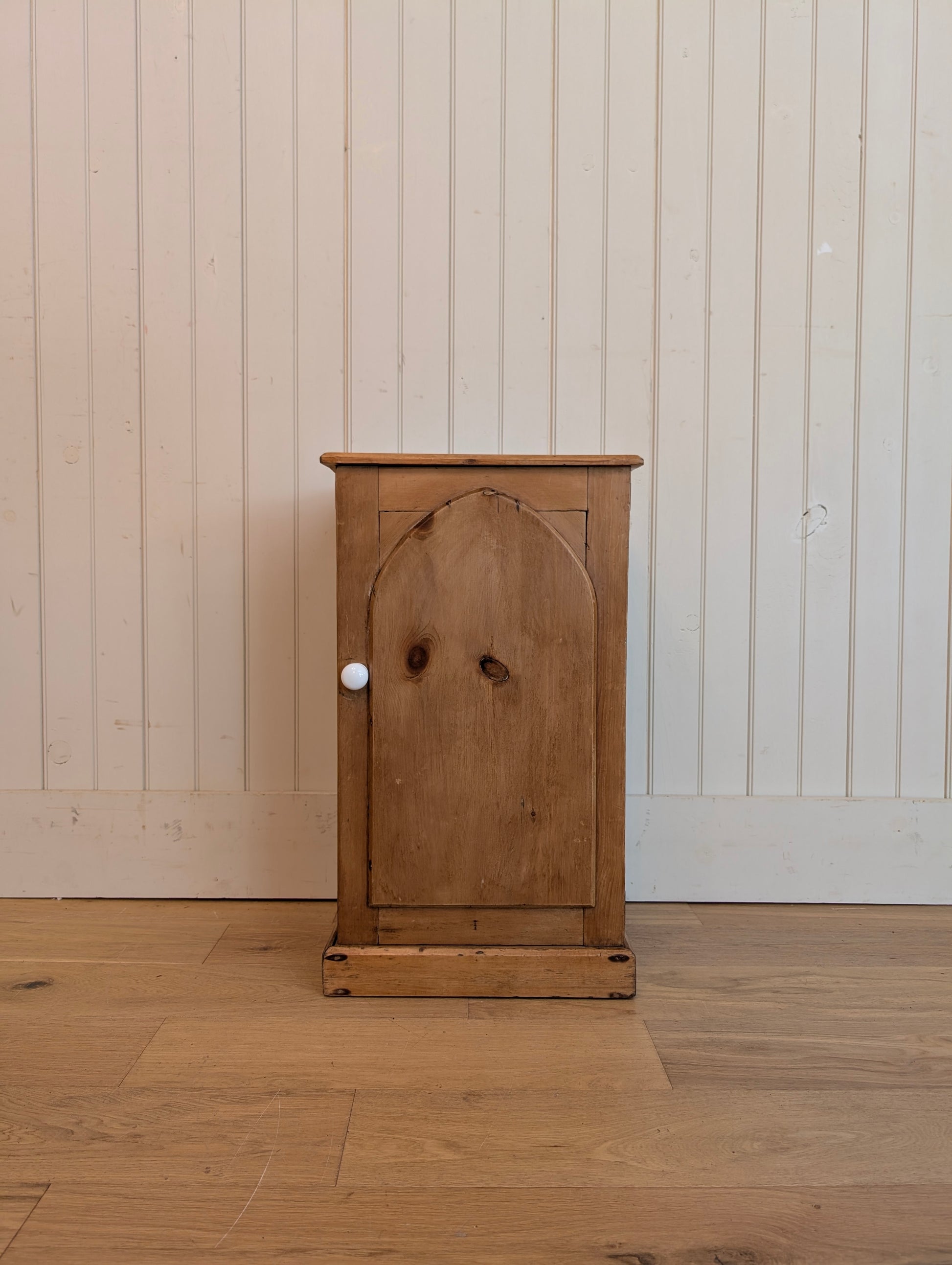 A single door English pine bedside cupboard. There is one interior fixed shelf. The door has an arch door, a nod to the church it came from.
