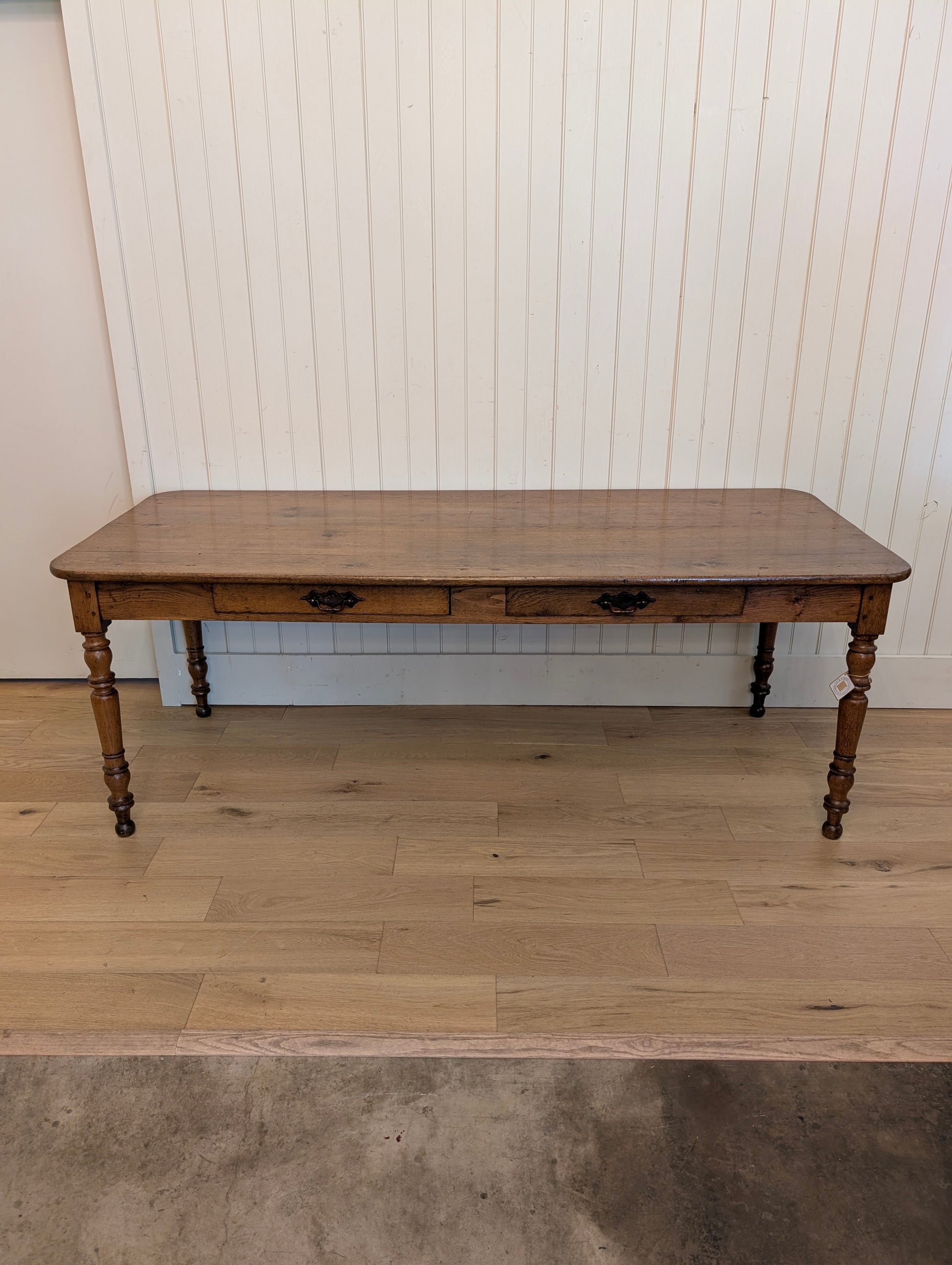 A late 1800's solid oak Victorian 2 drawer table. Finished in a rich deep brown stain, there appears to be a protective coat (poly?) over the top. The hardware is original to the table. Please note, the chair is not included, shown only for leg room/clearance.