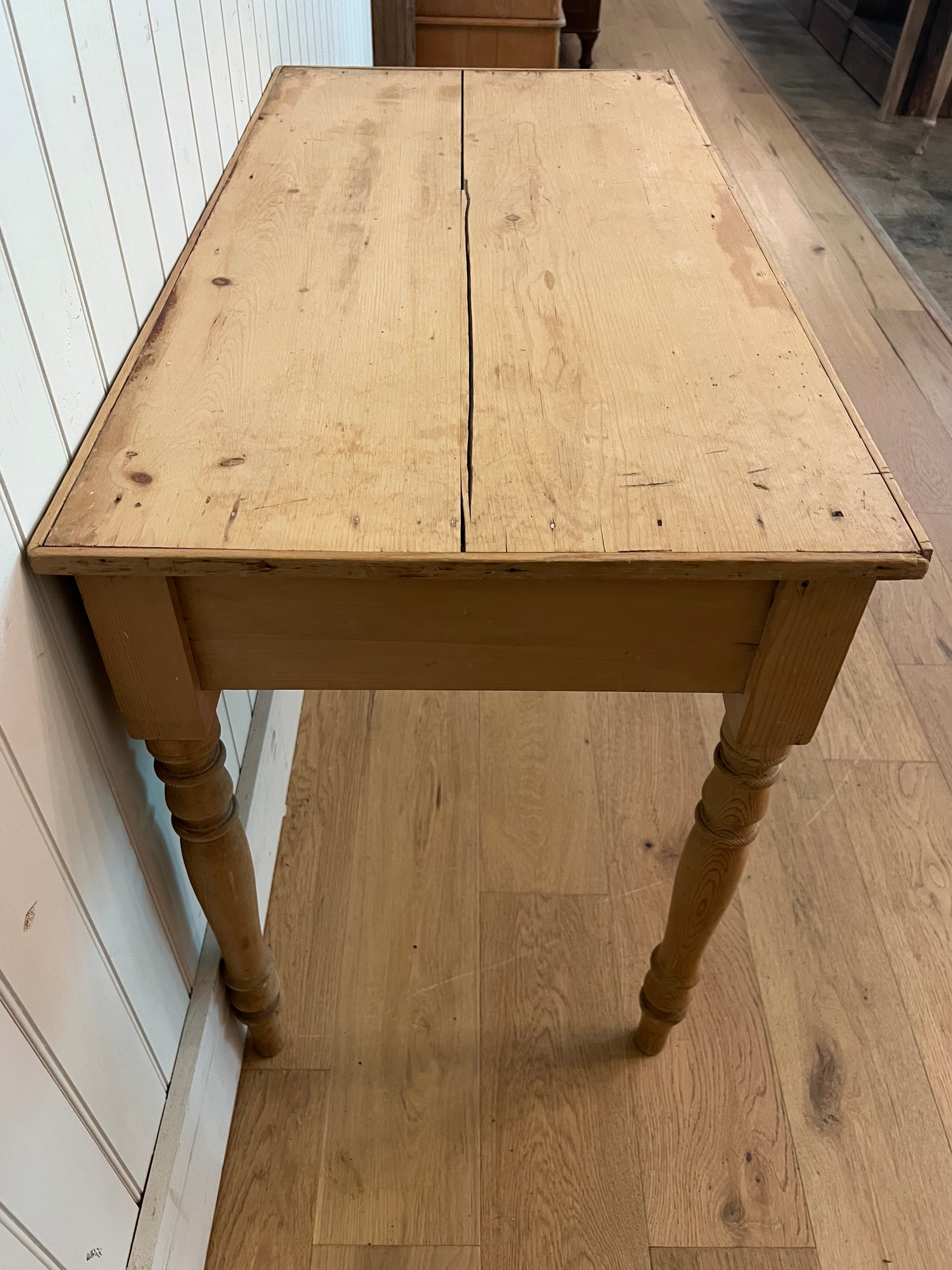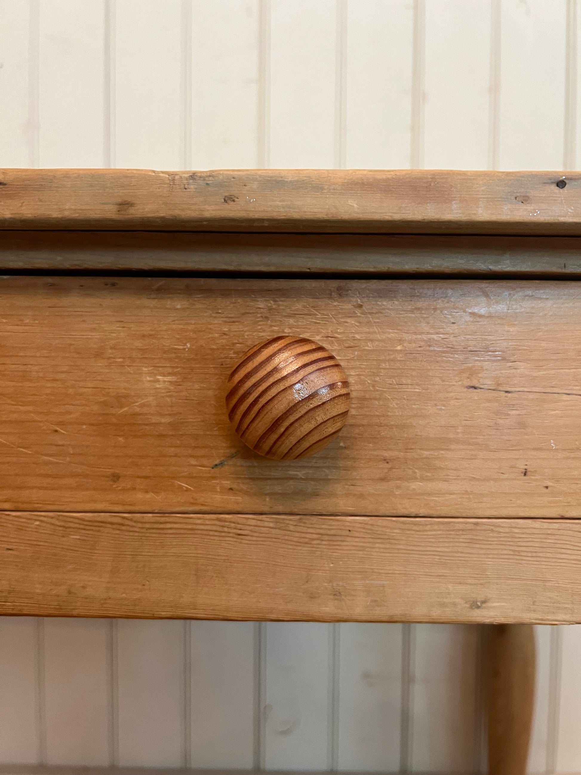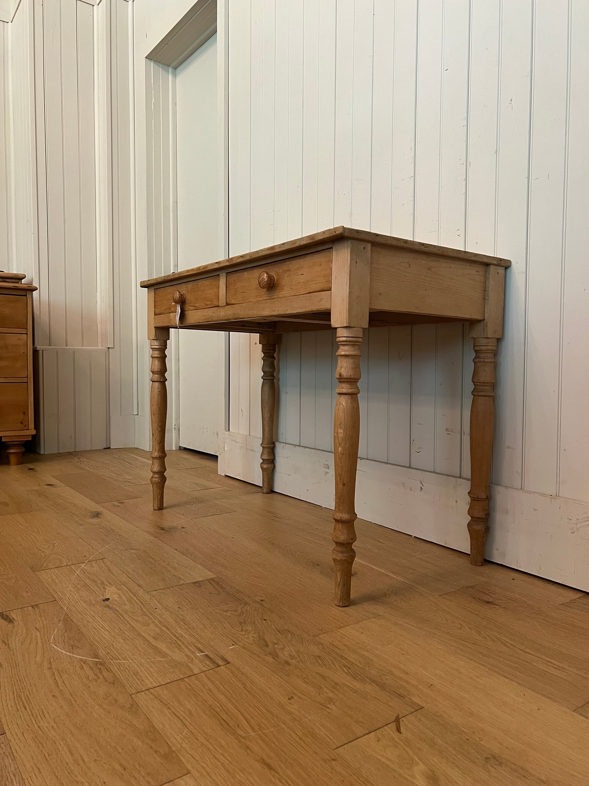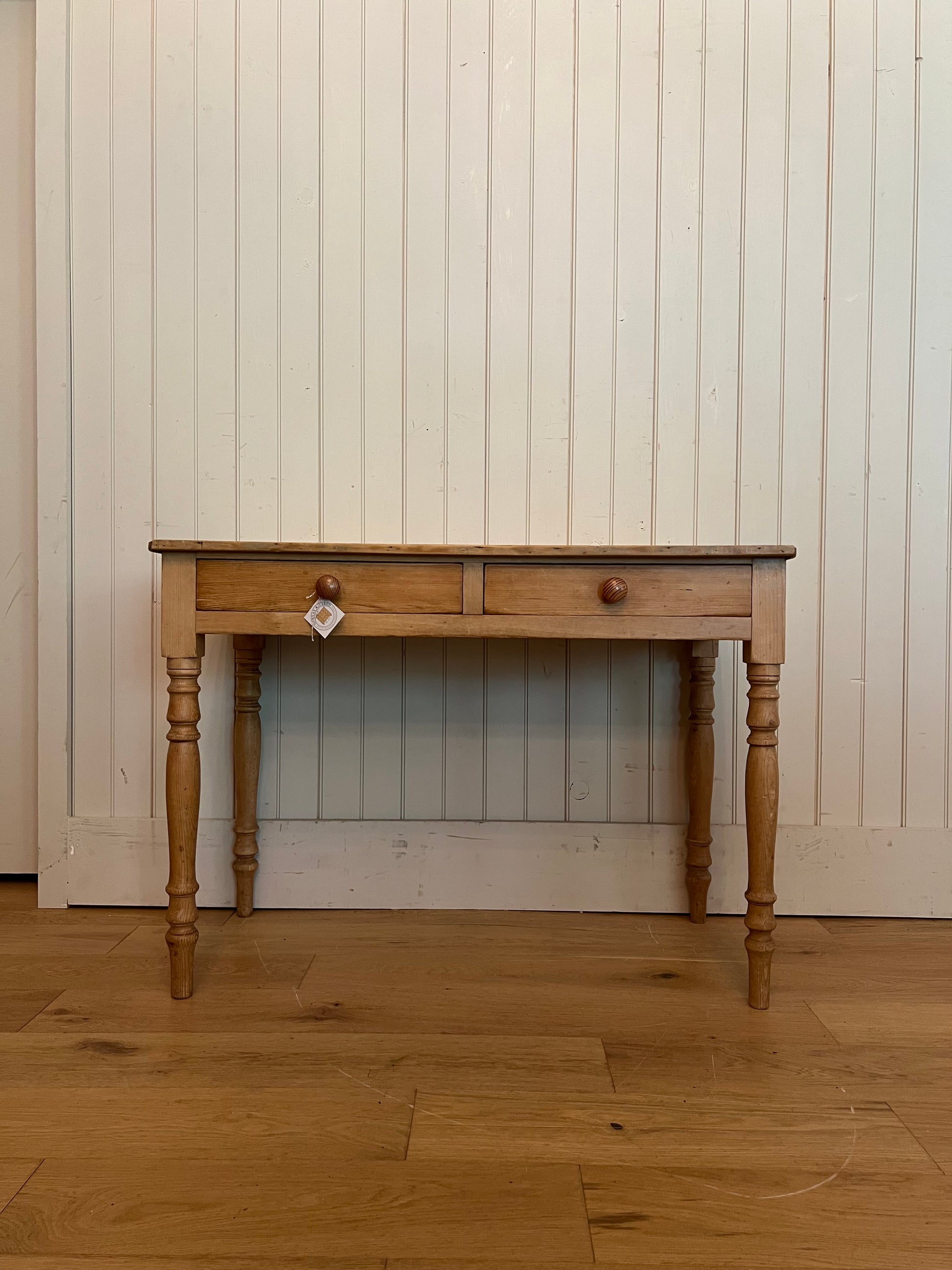 Perfect as a desk, entryway table, or makeup vanity, this English pine table has two drawers. The finish is waxed and read light in person. The hardware on the drawers is wooden.
