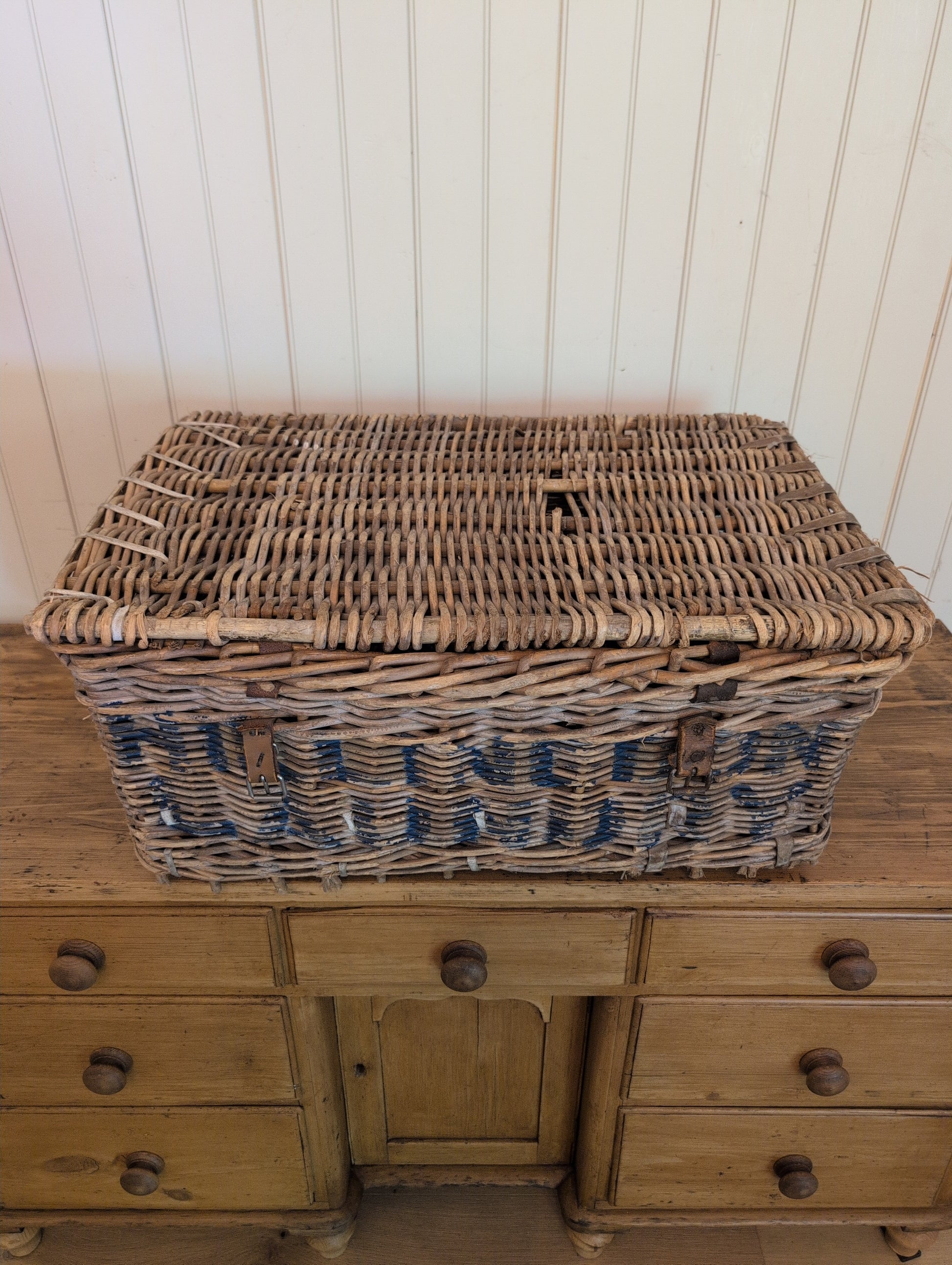 Lidded English Laundry Basket with both front and back stenciling reading "Hillingdon Laundry". There are bottom runners in good condition. One of the front leather straps is original and no longer can latch, while the other has been replaced and is in good condition.
