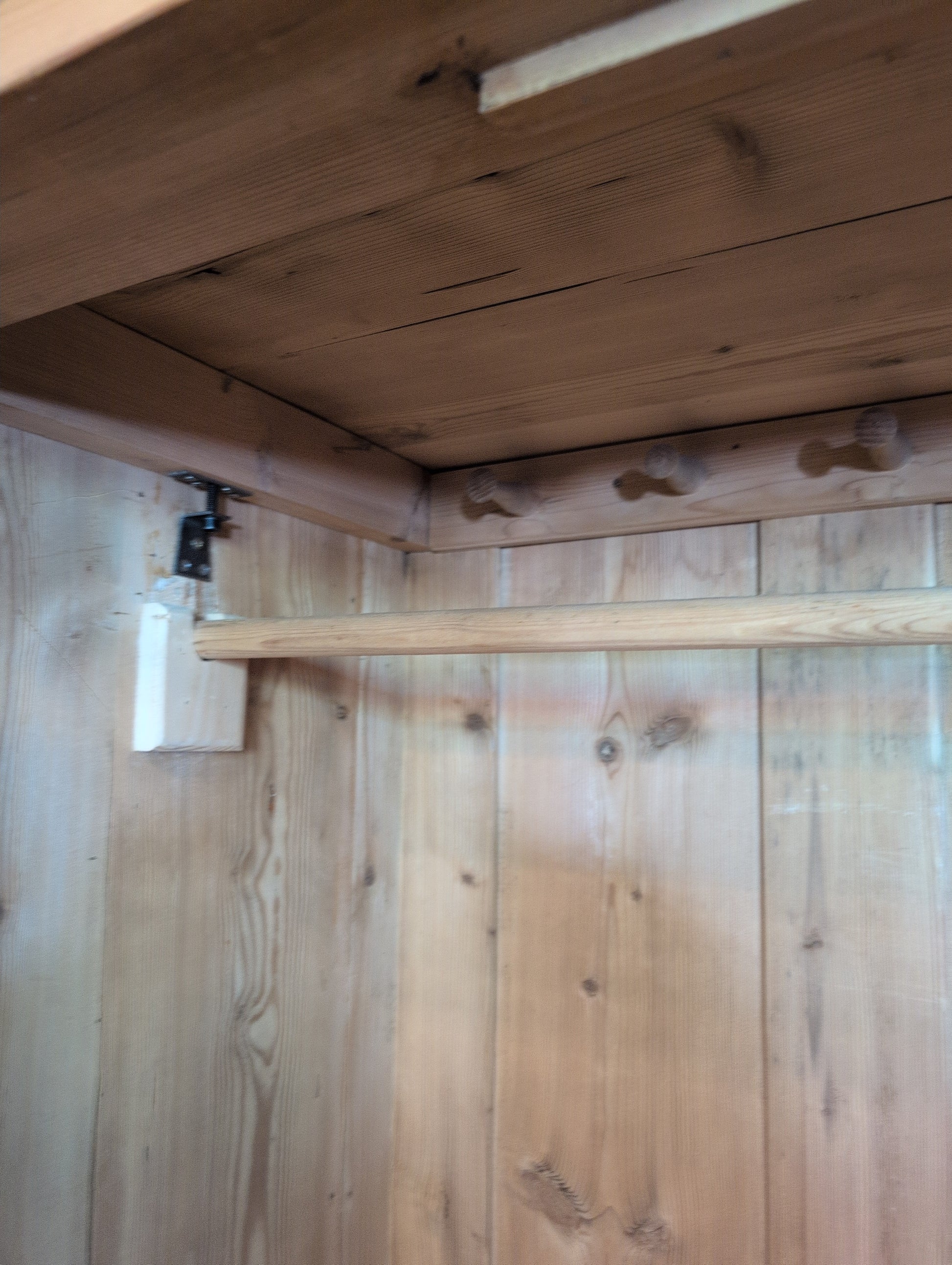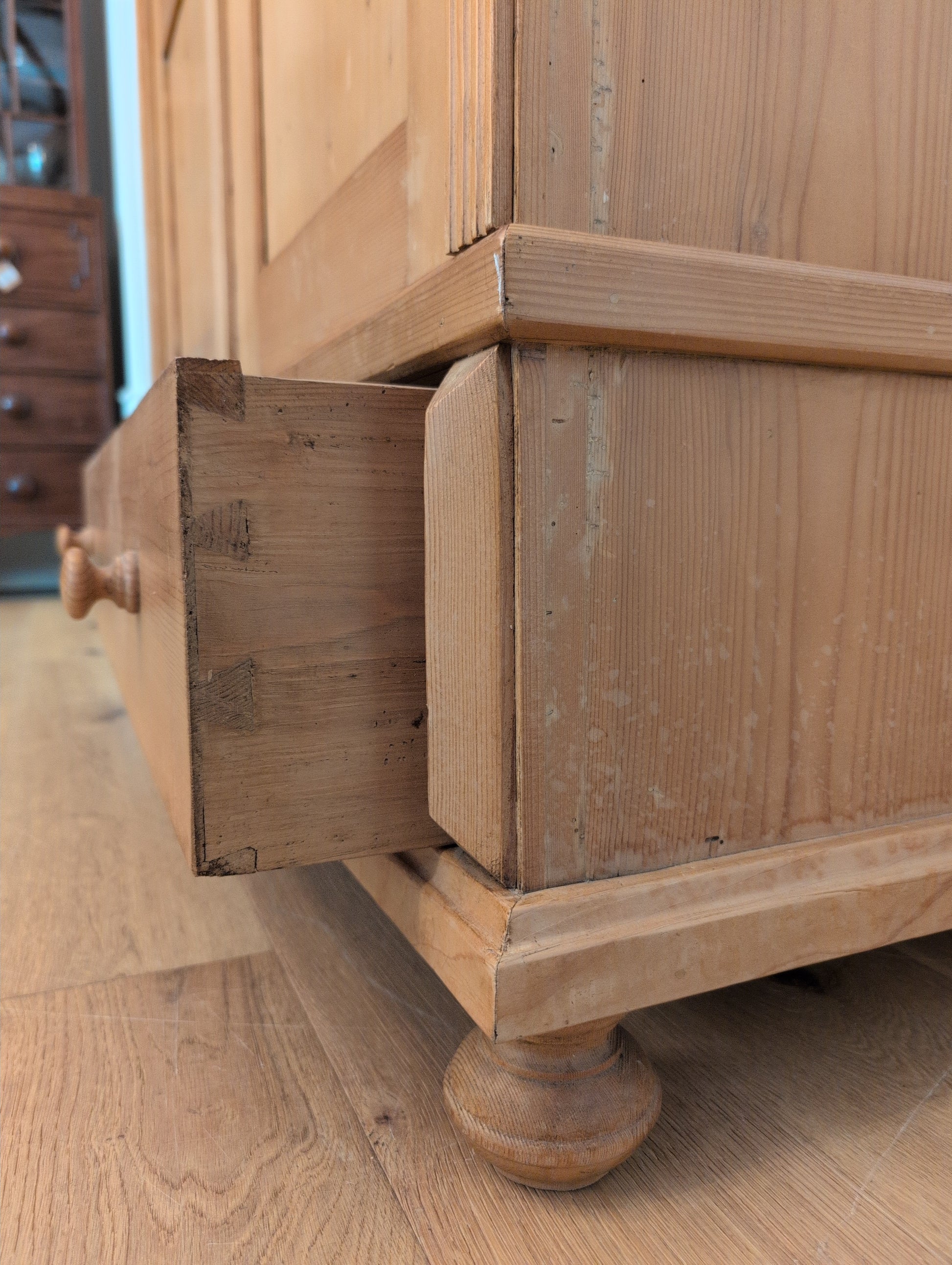 A European arch door knockdown wardrobe. This piece has one central clothing rod with one bottom drawer. At under 4ft wide, this is ideal for smaller areas of the home in need of hanging storage. The base is fully waxed and the original skeleton key is present. Please note the small imperfections on the left side door as shown in the last photograph.