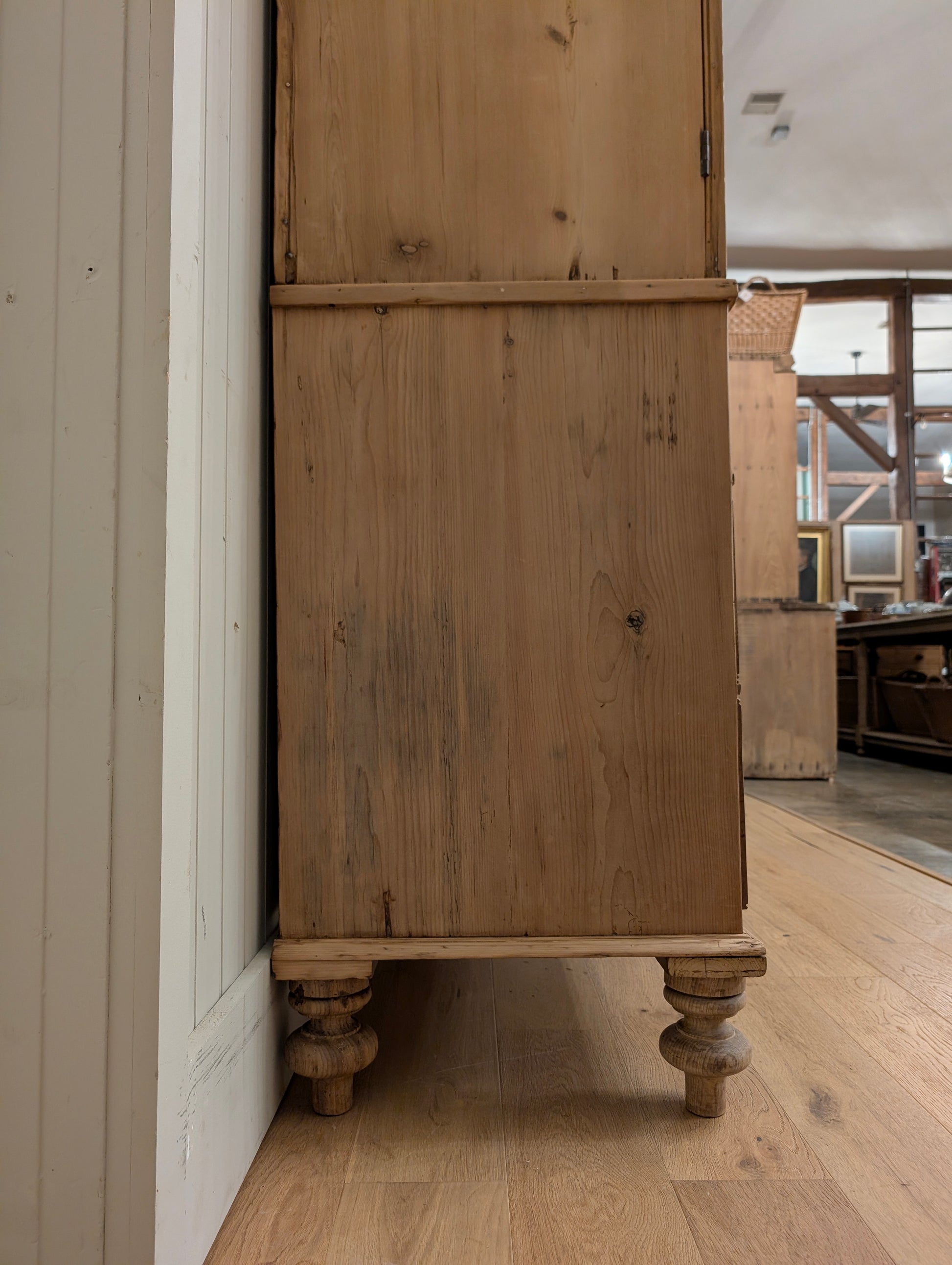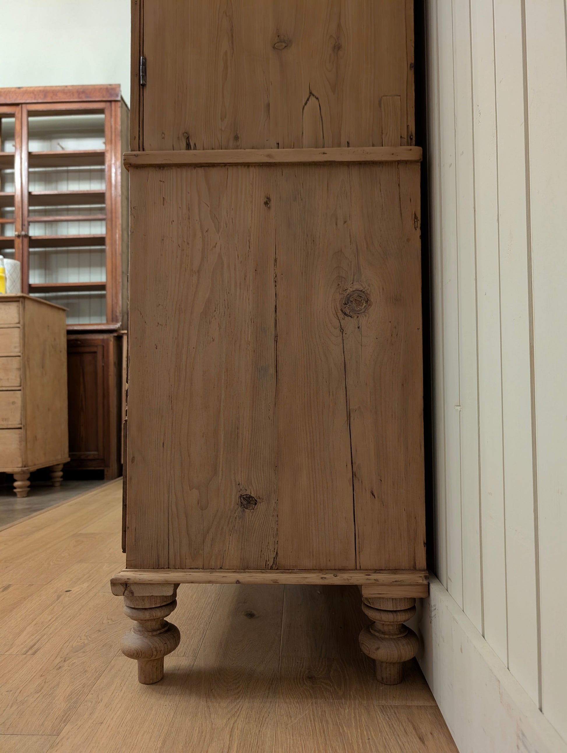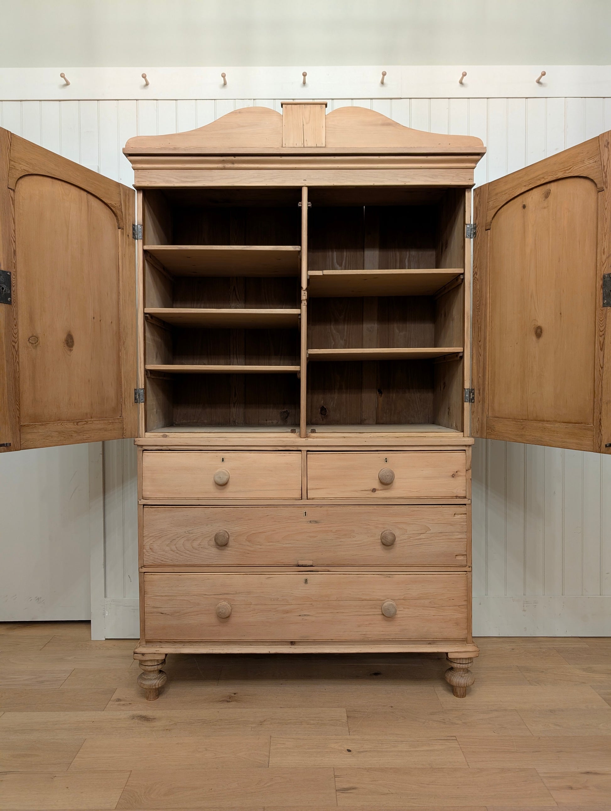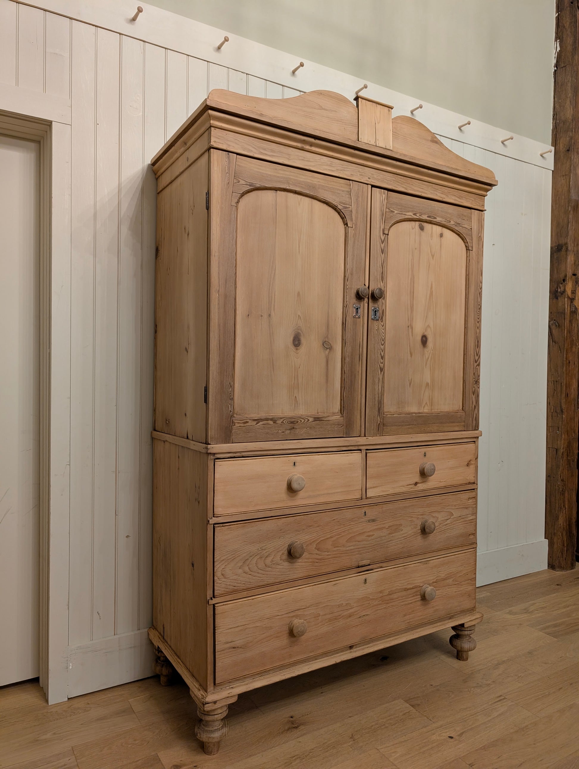From an estate close to the Scotland border comes a superb stripped pine linen press. Finished in a clear wax, this linen press has an abundance of storage. There are multiple shelves on the upper portion, ideal for your sweater, blankets, and bulkier items. Both doors have a top latch installed on the interior to keep the doors closed. The base is a classic 2 over 2 design with wooden knob hardware, hand cut dovetails, and smooth gliding drawers. We can't get enough of the stately tulip feet it rests on, as well as the curved cornice.