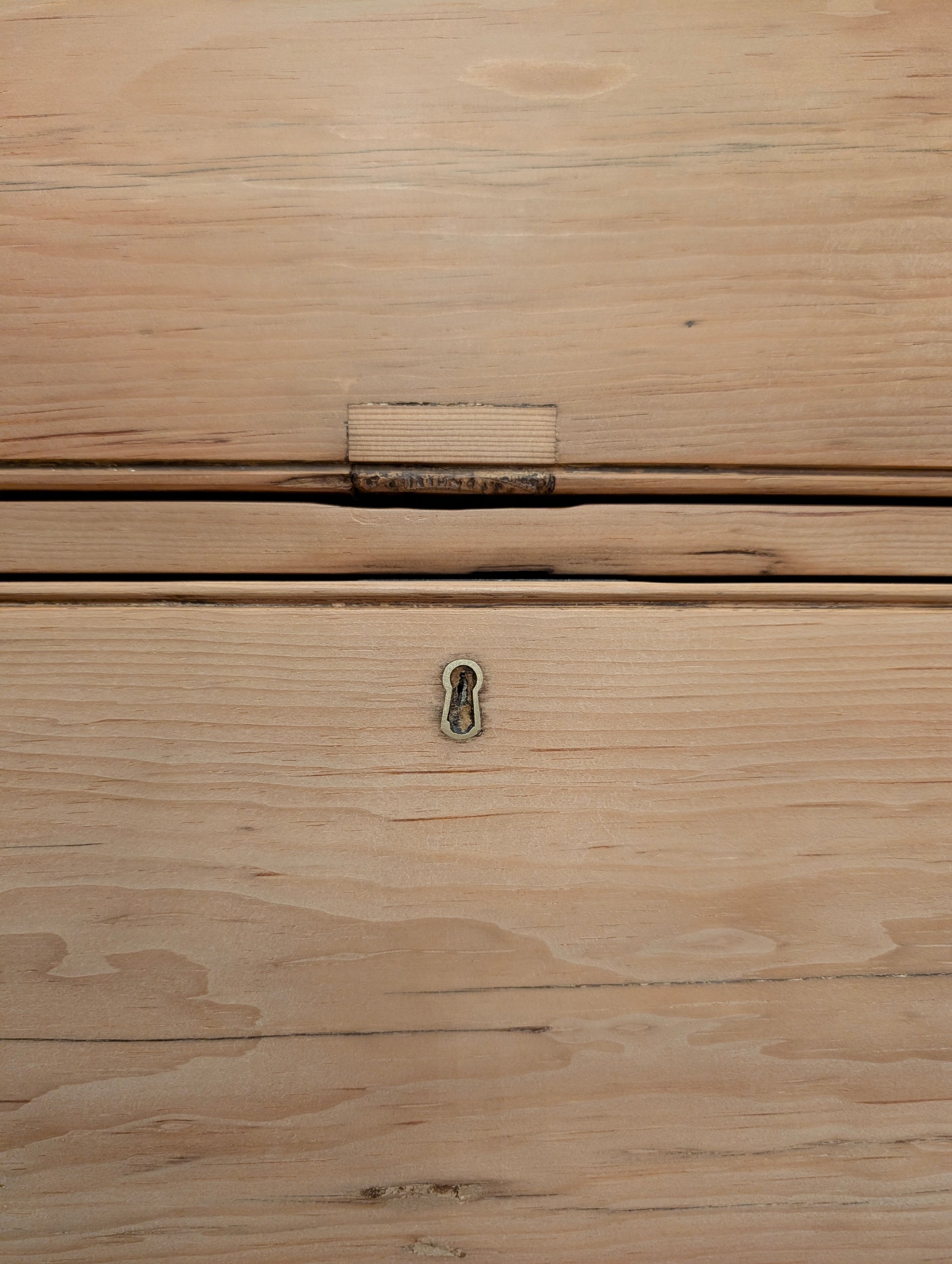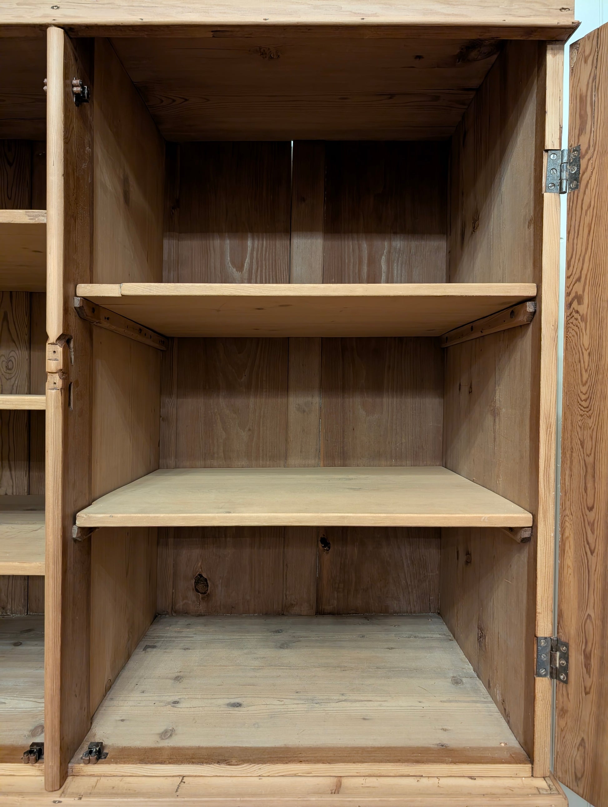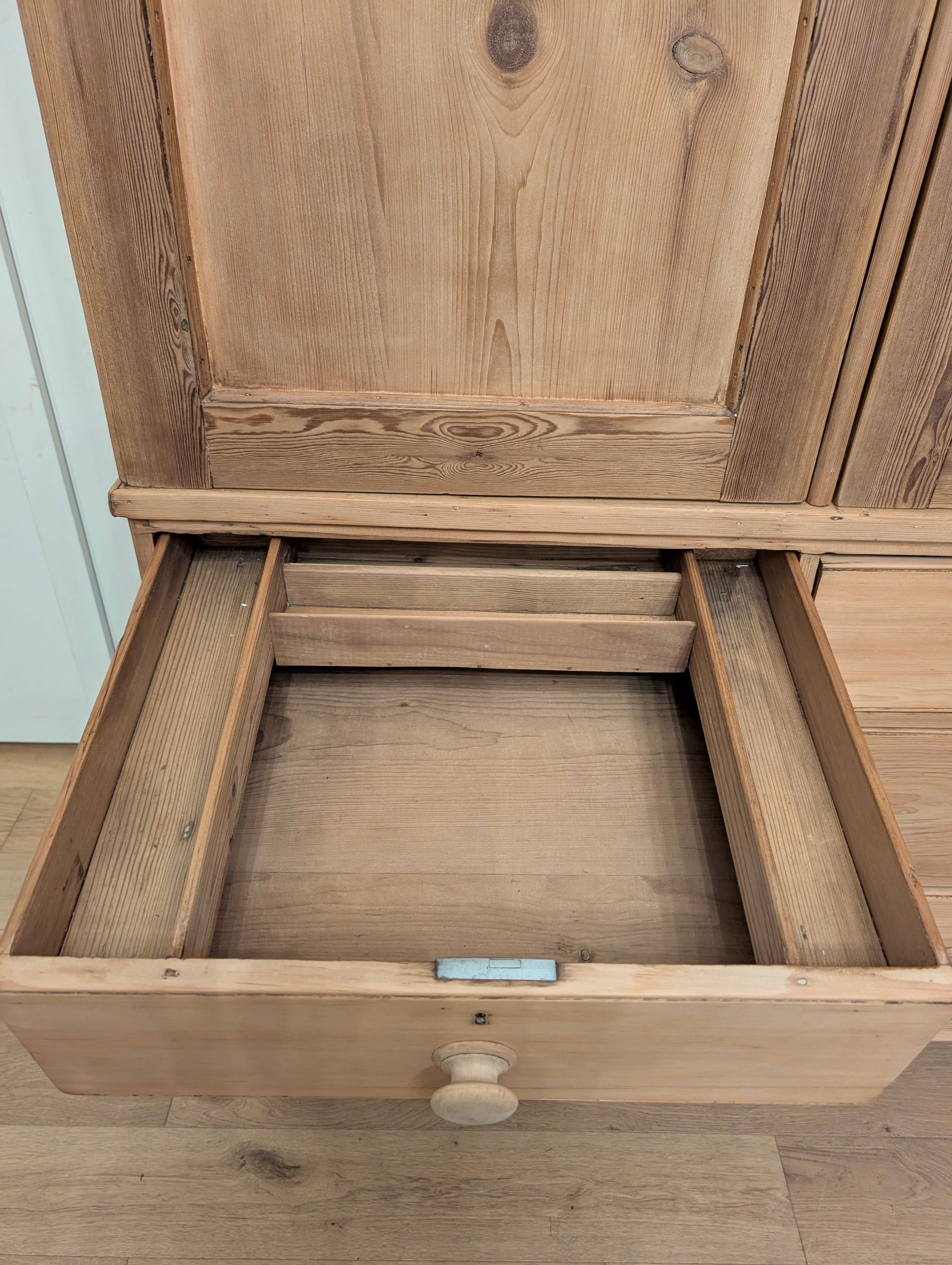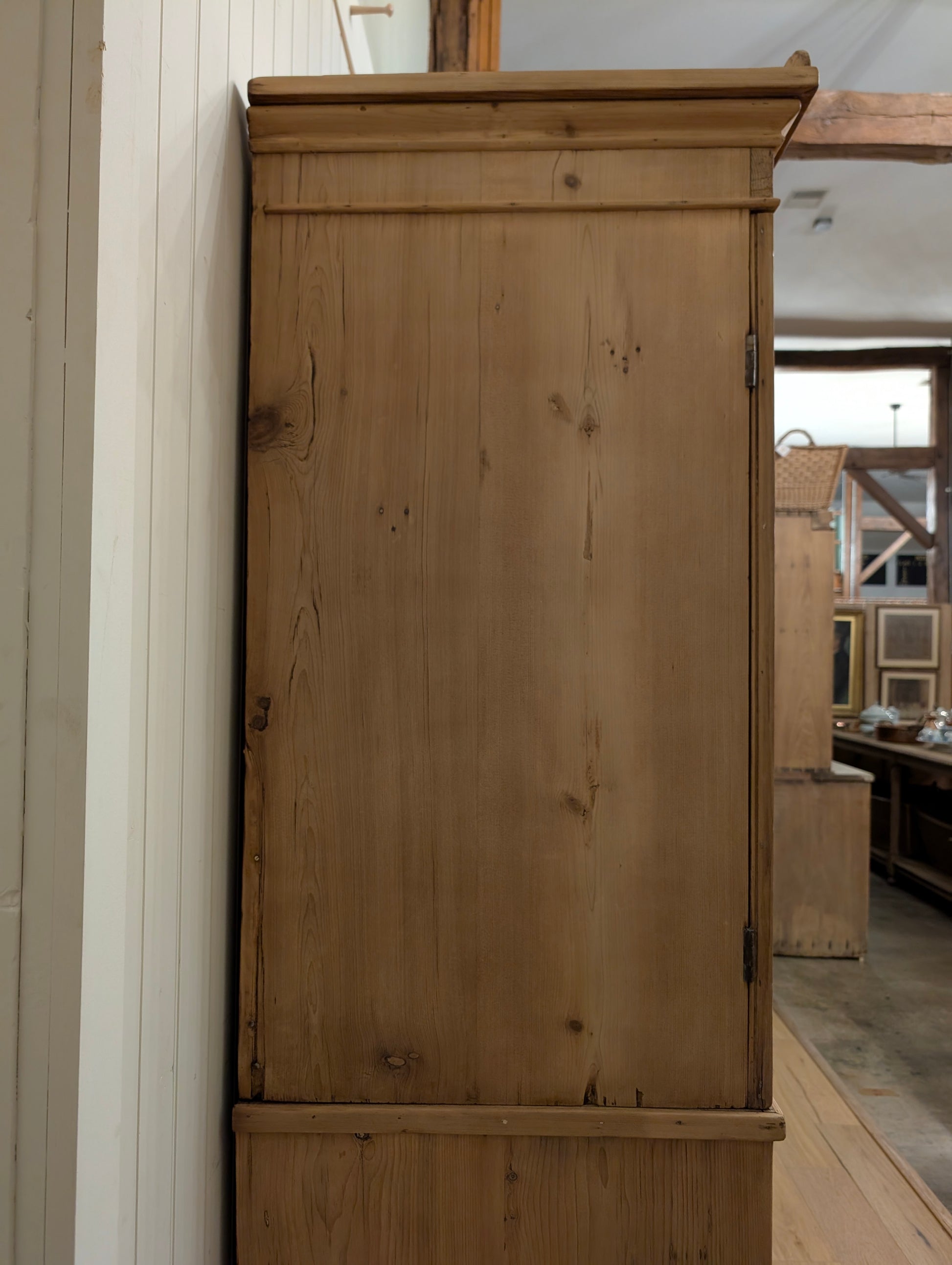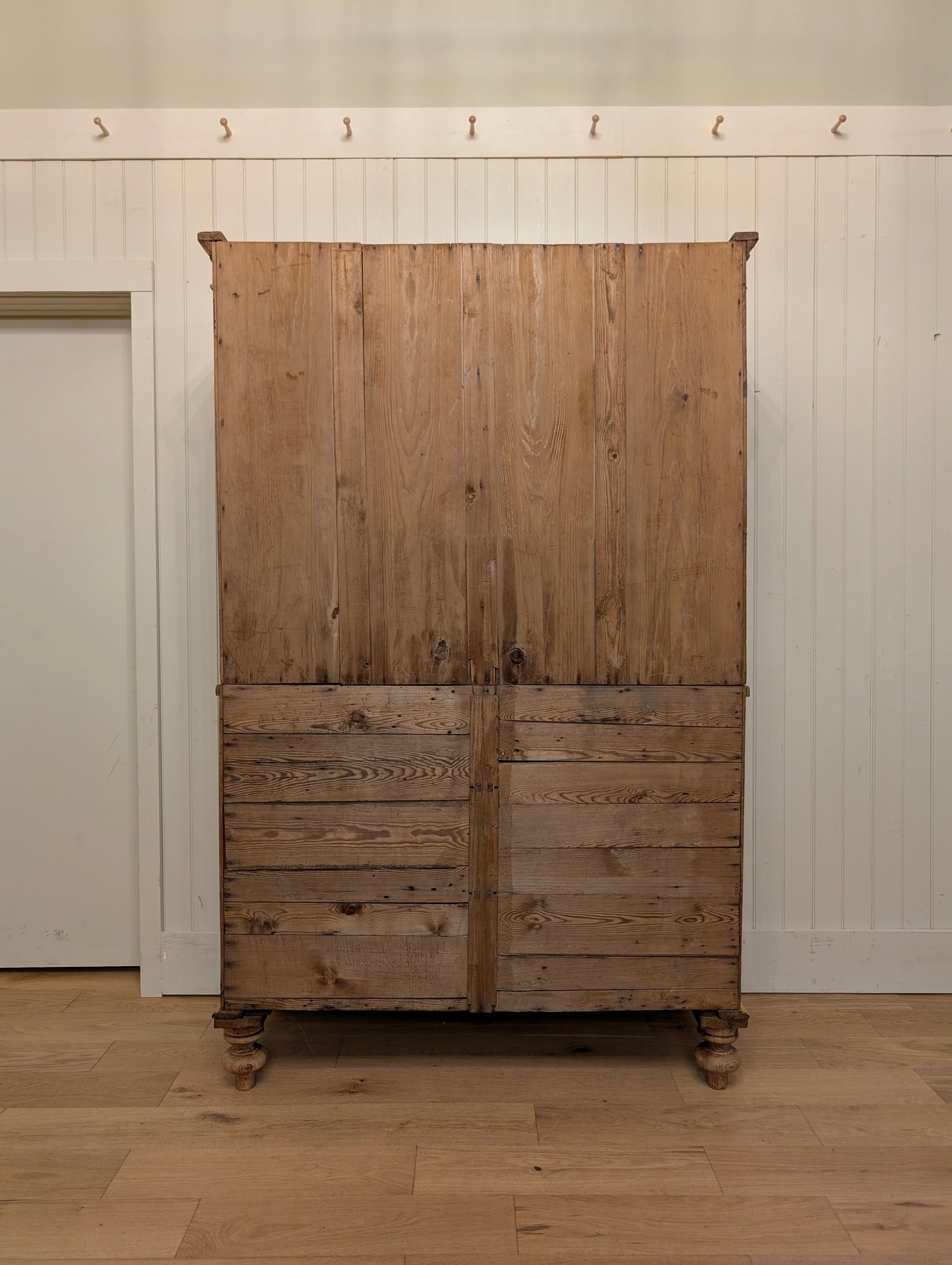 From an estate close to the Scotland border comes a superb stripped pine linen press. Finished in a clear wax, this linen press has an abundance of storage. There are multiple shelves on the upper portion, ideal for your sweater, blankets, and bulkier items. Both doors have a top latch installed on the interior to keep the doors closed. The base is a classic 2 over 2 design with wooden knob hardware, hand cut dovetails, and smooth gliding drawers. We can't get enough of the stately tulip feet it rests on, as well as the curved cornice.