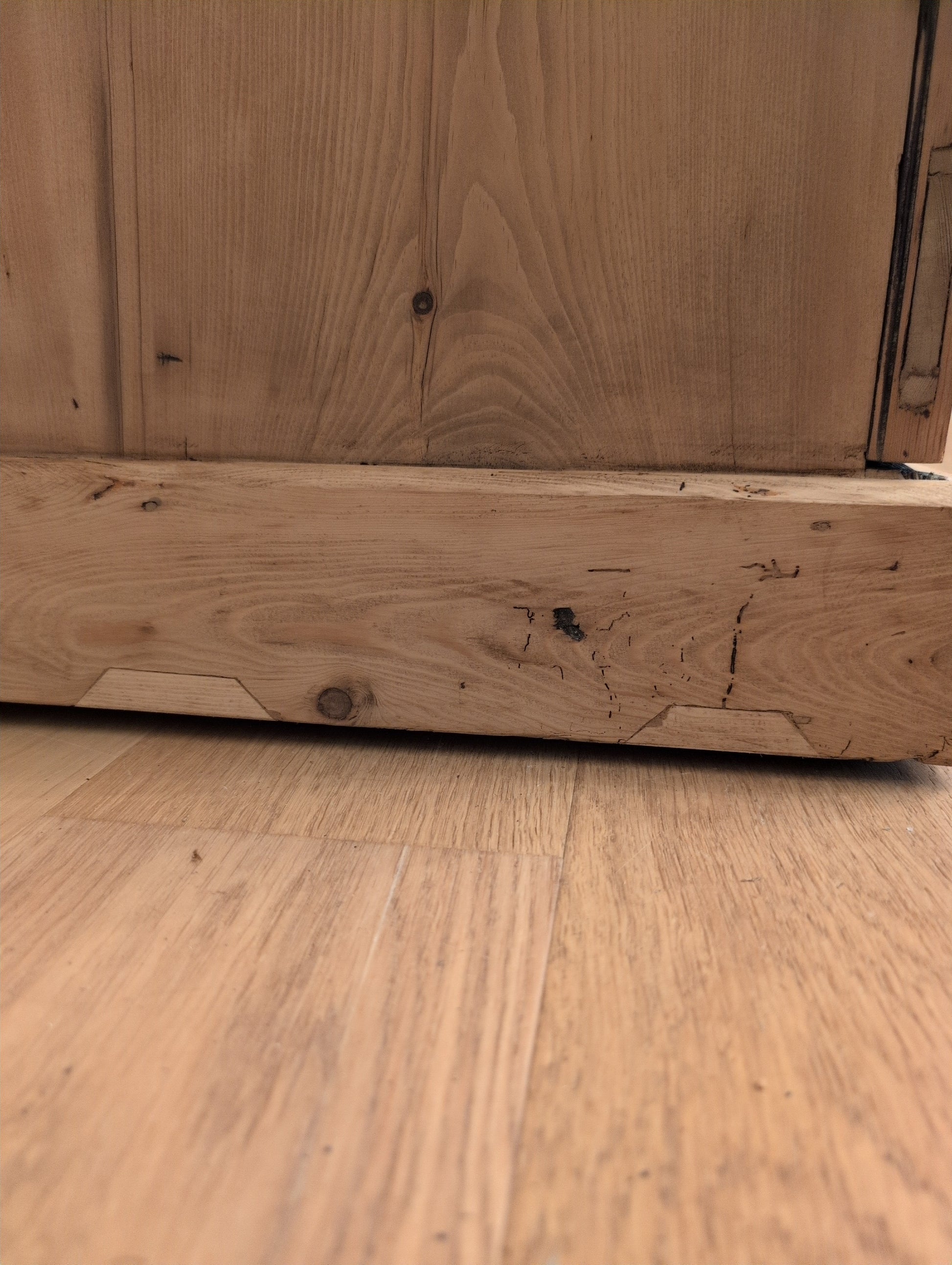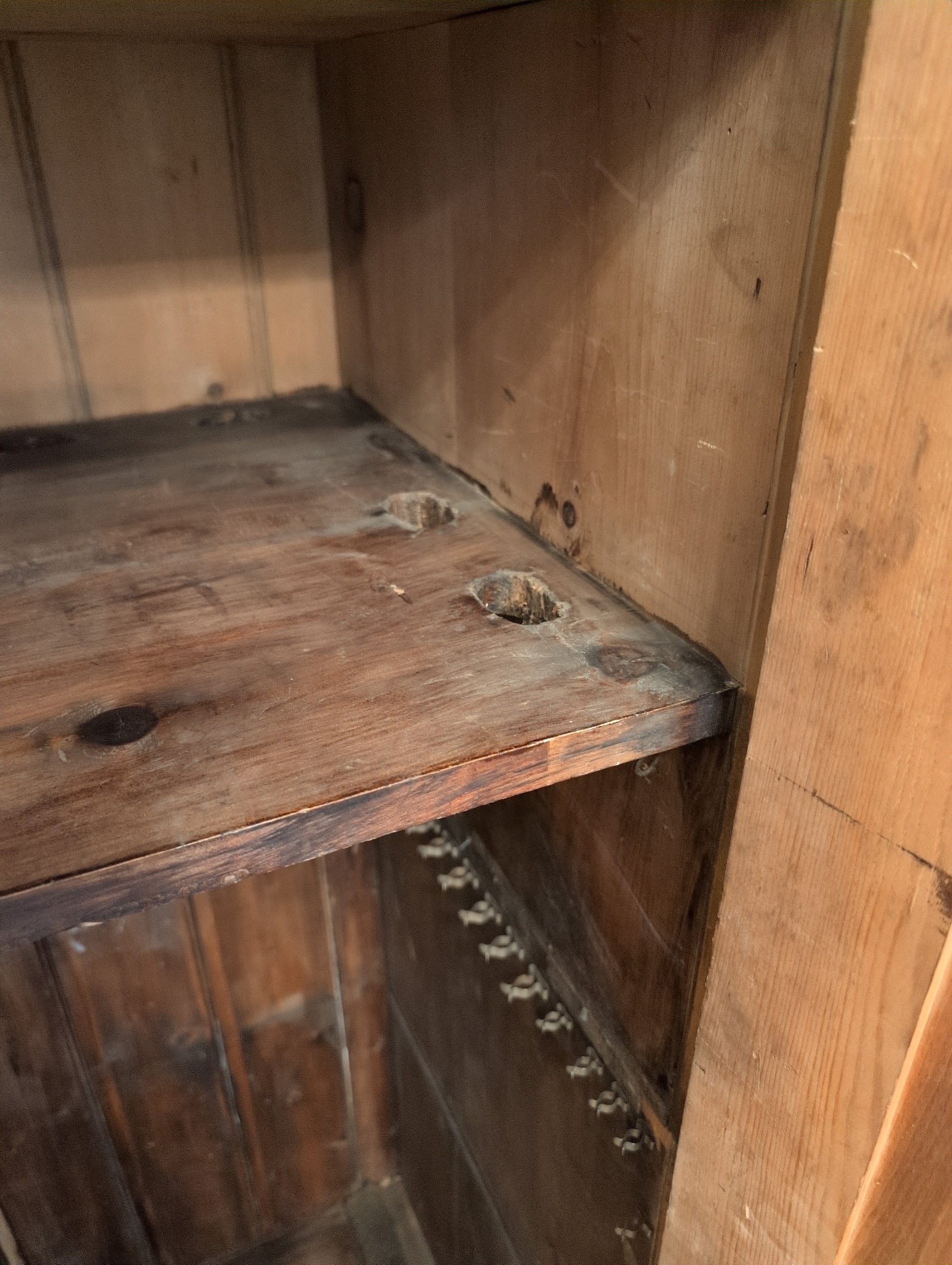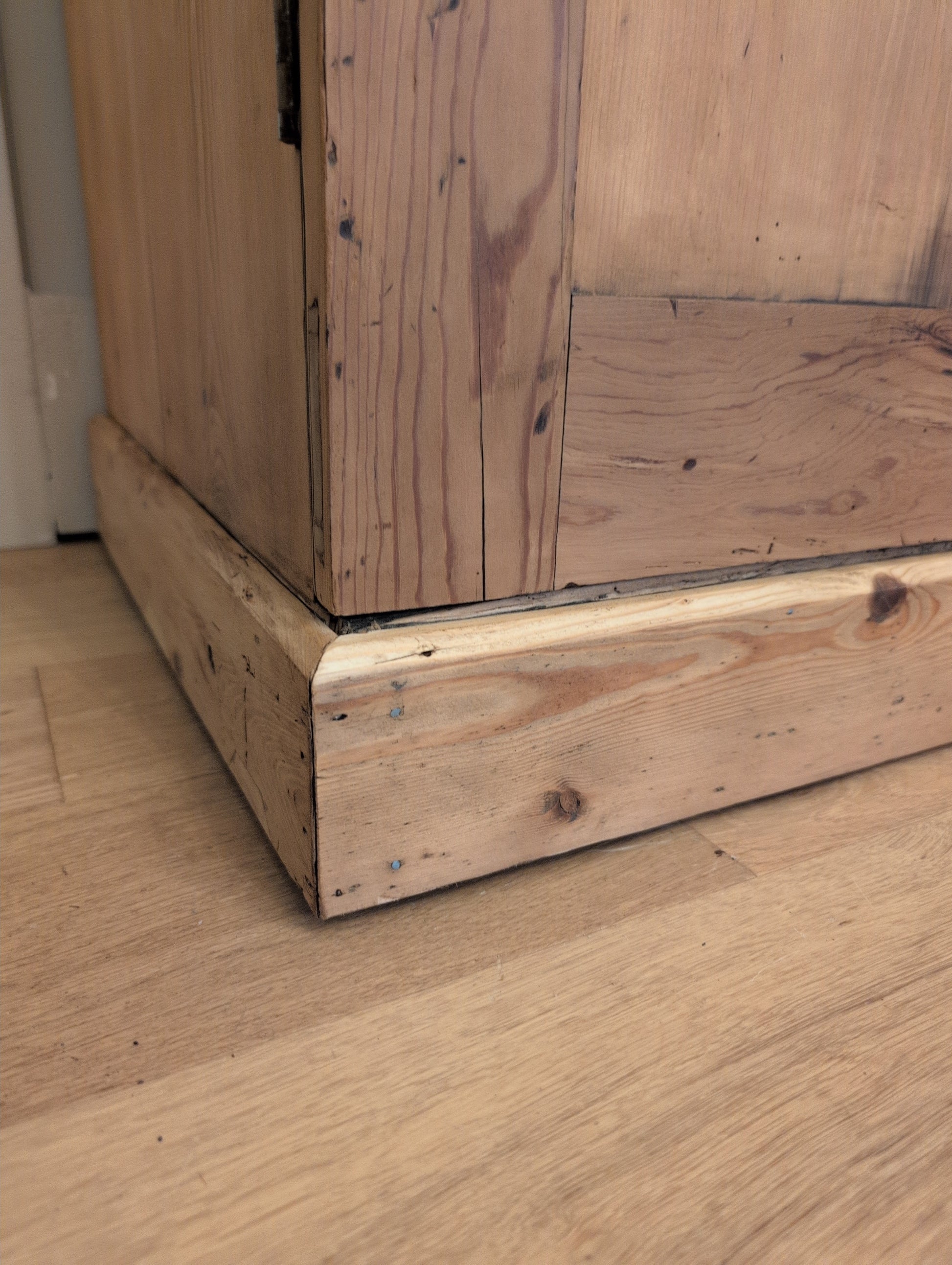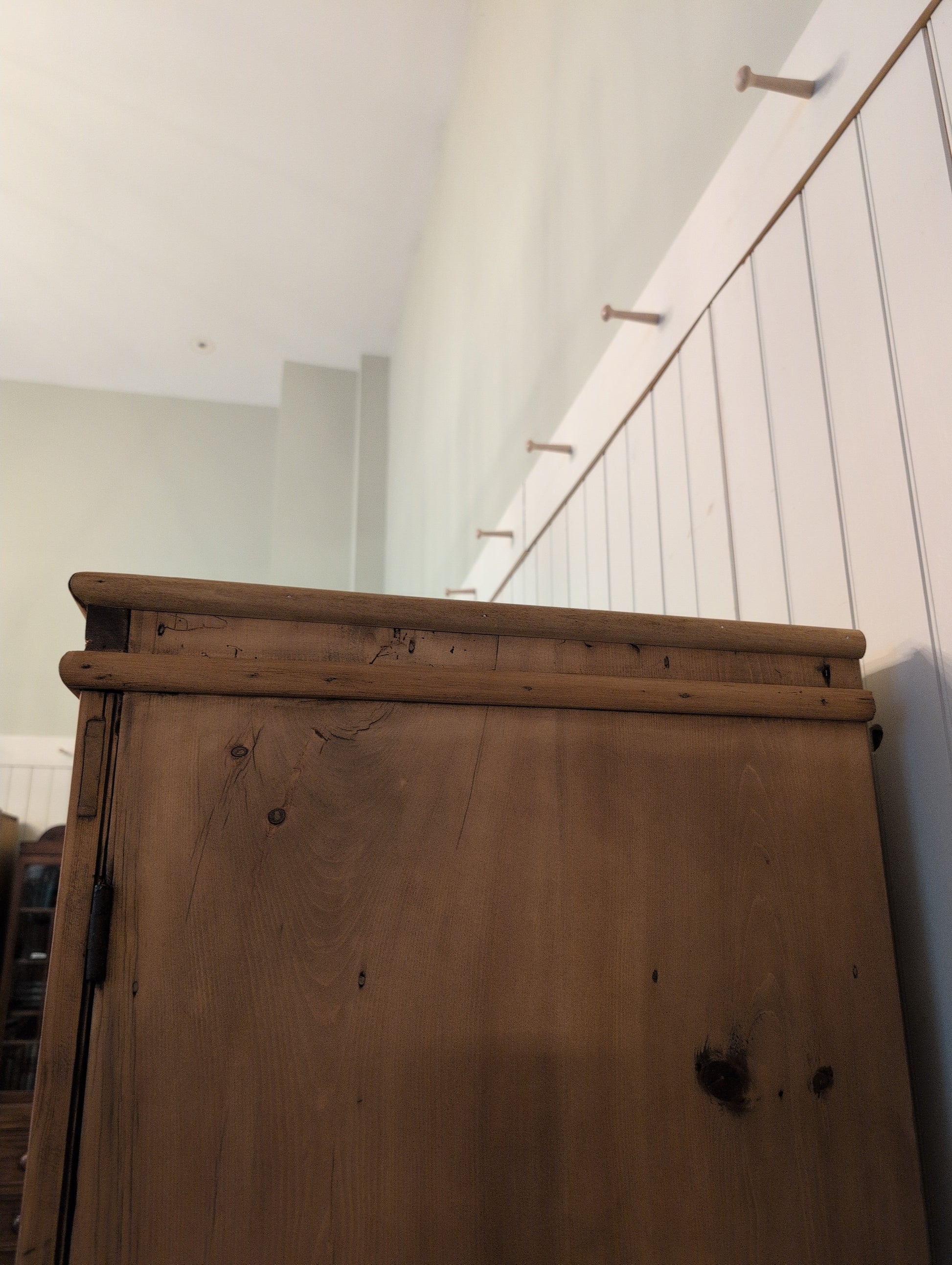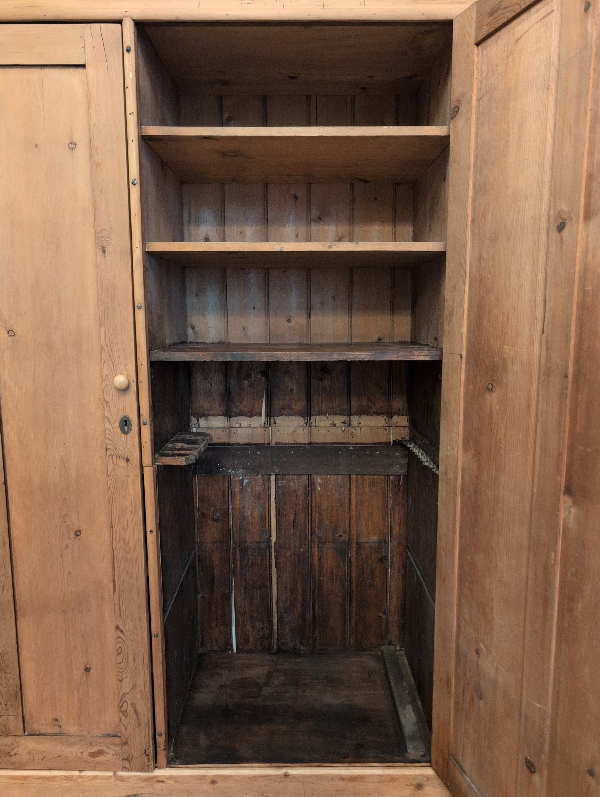 From a Georgian manor home in Wiltshire county, comes a stunning 7.5ft country cloak closet. It's prior owners were quite the entertainers and used it in their billiards room to hold cue sticks. We have left the notched shelf and metal clips, which can easily be removed. Whether converted back to its original use of storing jumpers, blankets, and shoes, or alternative storage, this is a rare statement piece. We have stripped off the dark lacquer finish, and waxed it in a warm medium brown. This piece is mid Victorian era (1837-1901), entirely English pine, and comes apart in multiple pieces. The body is split down the middle in two sections, and each door must be removed and reinstalled during movement.